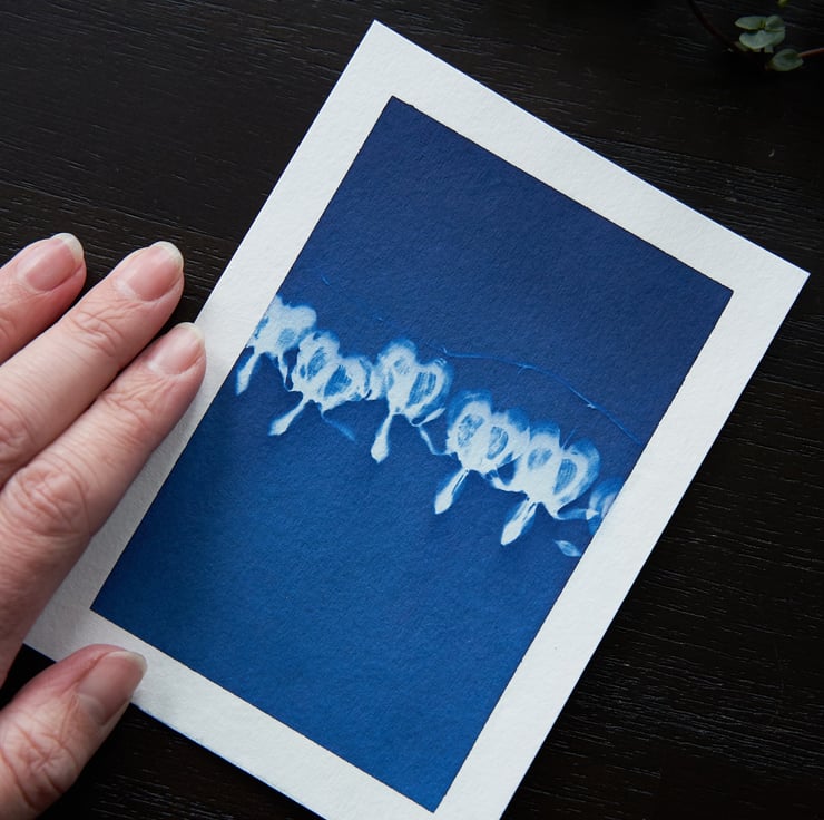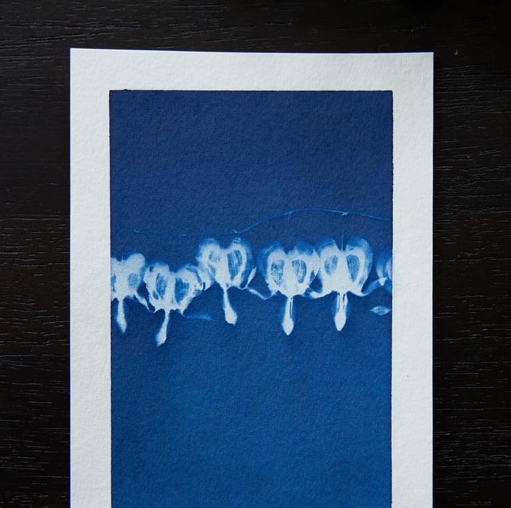 I absolutely love the effects wet cyanotype can produce and it is captured beautifully in this print which features the beautiful and very well loved bleeding hearts. I used wet cyanotype mix, vinegar and bubbles to create the textured effect for the background, with the bleeding heart flowers laid over the top to capture its detail.