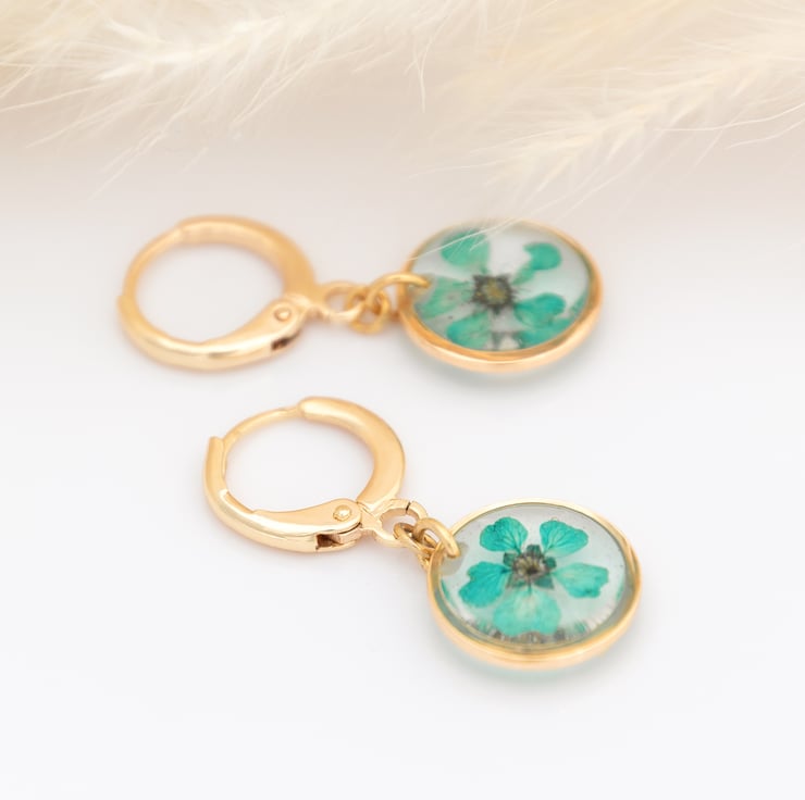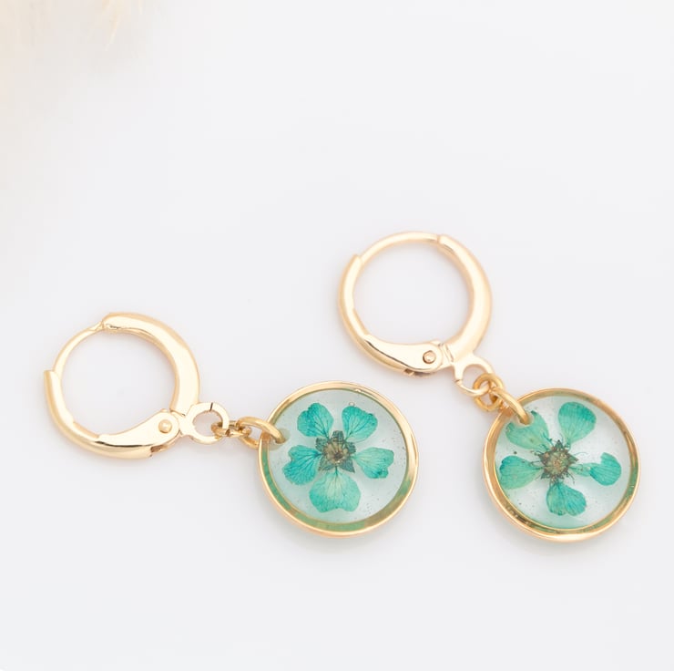When creating these earrings, I've instantly been drawn to the harmony between the gold colour of the earrings and the vibrant turquoise of the flowers, both colours complimenting each other so much, making each other pop and stand out. I wanted to create something dainty and understated, which can still add a pop of colour and nature's joy to any outfit.