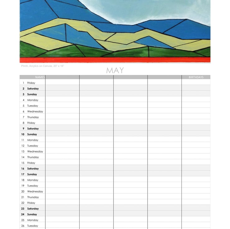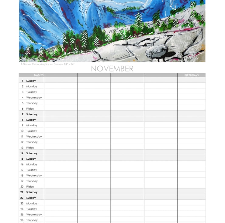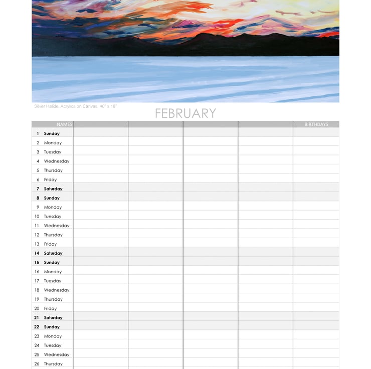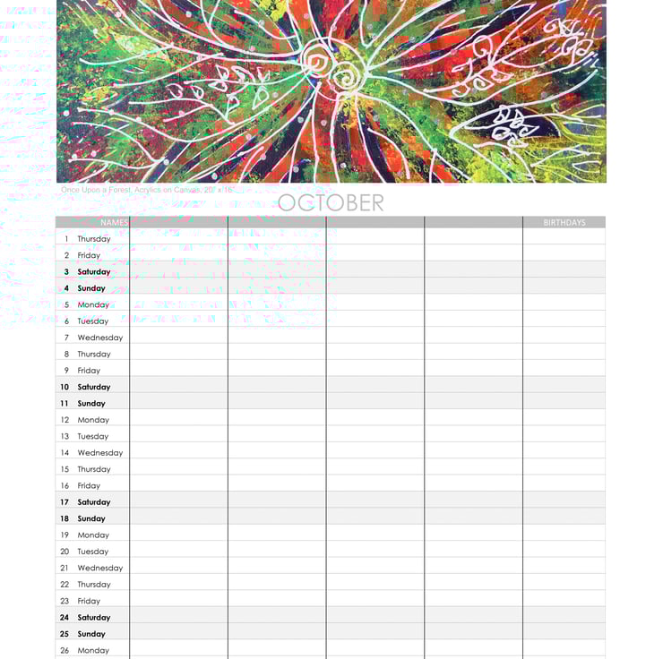 An A3 (42 x 30cm) high quality printed thumbcut art calendar covering January to December 2026 inclusive. Features a gloss printed 350gsm front cover and year overview page. Printed on 170gsm silk paper which is recyclable, FSC certified ECF bleached and wood free. Each page comes with a calendar column split into 4 to record what each member of your family is doing!