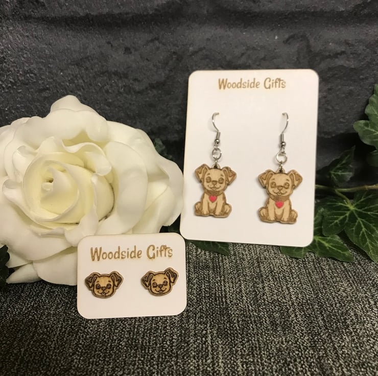 Cute dog earrings with a hand painted red heart on it's collar.. These cute little puppies are laser engraved and hand finished before being attached to stainless steel fixings.
