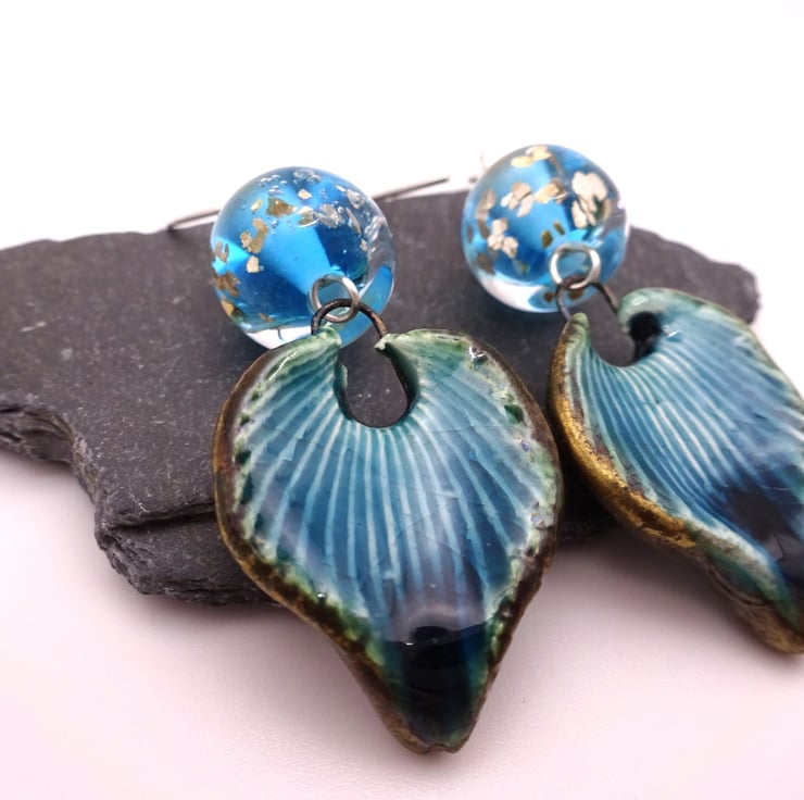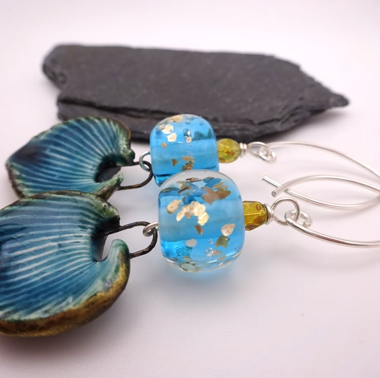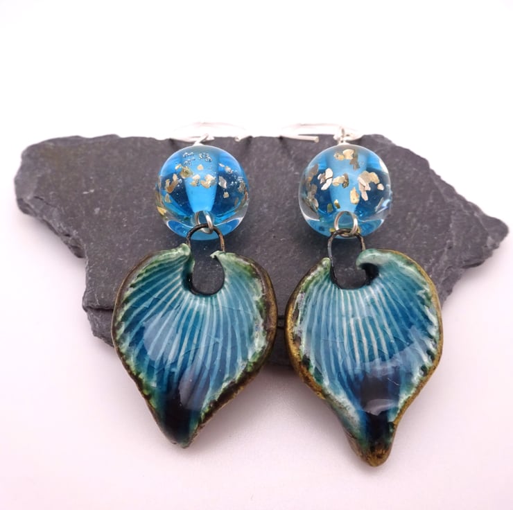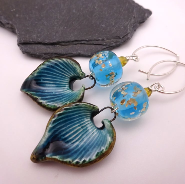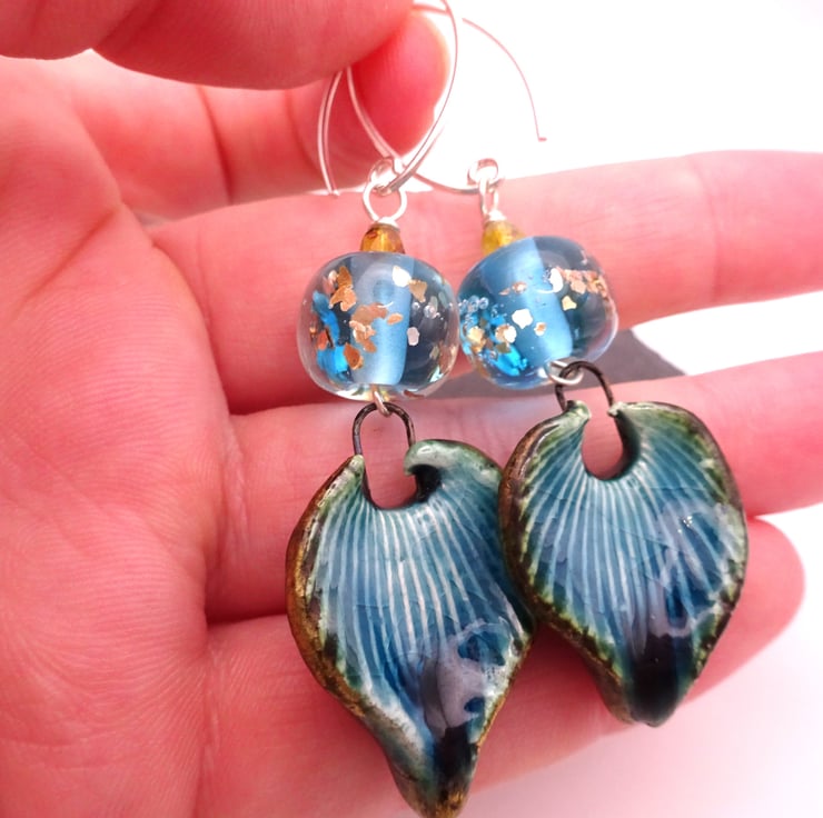 A pair of earrings made with sterling silver ear wires, handmade blue and gold glitter lampwork glass beads and handmade blue ceramic leaves.