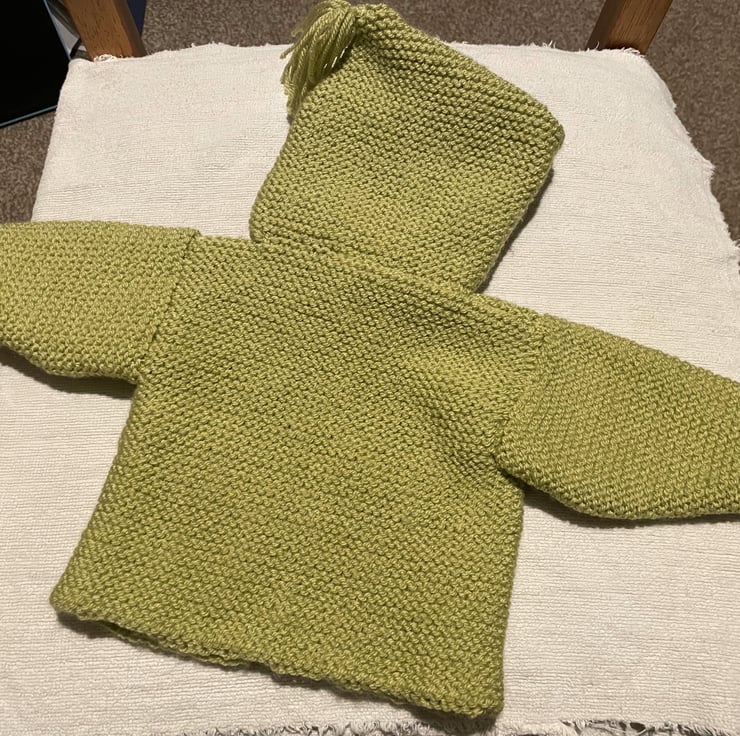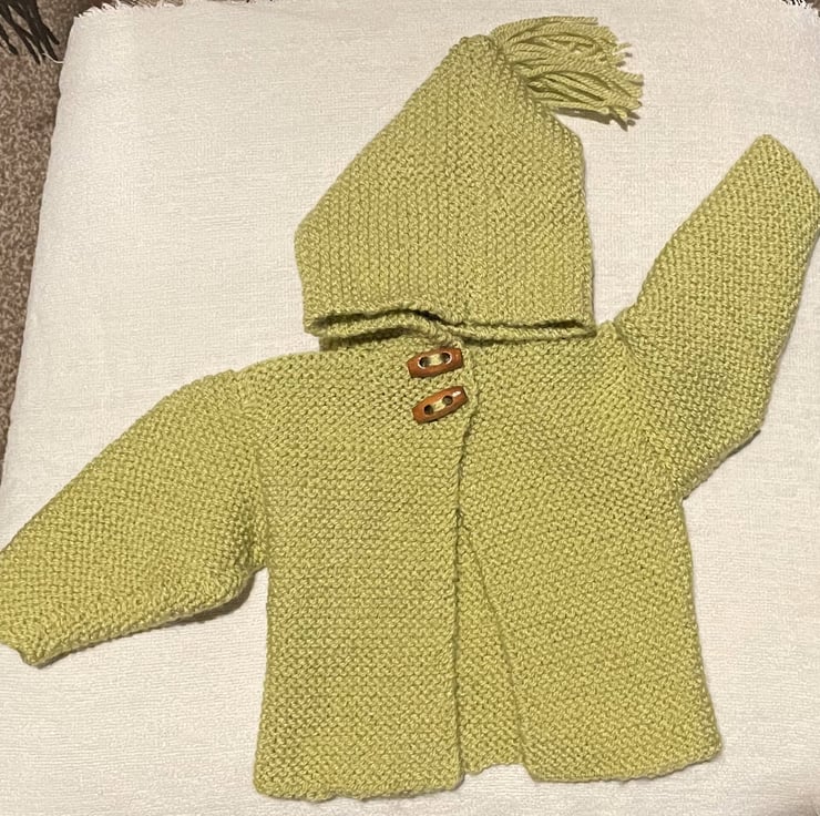 This fashionable handmade knitted cardigan is made with 100% acrylic yarn. It has 2 wooden buttons and a tassled hood. Machine washable as wool. Measurements: 37cm chest, body length 20cm, arm length 14cm.