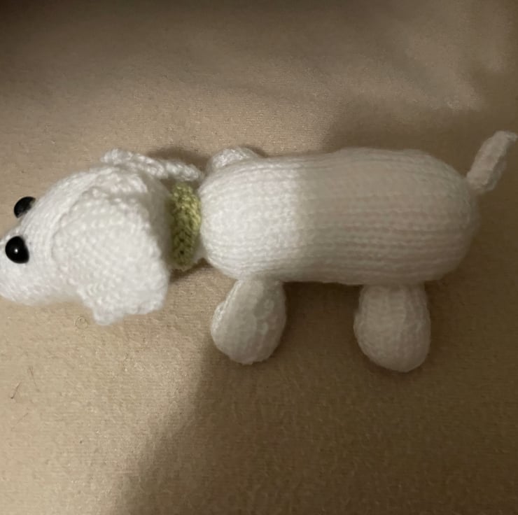 Also comes with a hand knitted dog toy with matching pistachio green collar. It measures 21cm x 10cm and has toy safety eyes, plus it is filled with hypo allergenic toy filling. Suitable for hand washing. Perfect for your baby or as a baby shower gift.