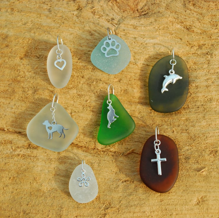 We create your choice of sea glass pendant with a charm! Choose from a range of glass colours and a variety of charms to receive your dream pendant. We find all our glass ourselves on British beaches, and offer it as original sea glass or smoothed sea glass. Our smoothed glass is made from pieces of sea glass which have rough edges, so we tumble them in sand to make them smooth and finely frosted. This process also brings out the colour of the sea glass.