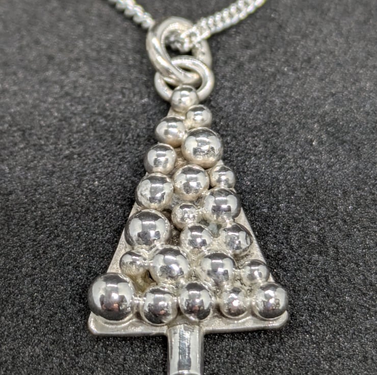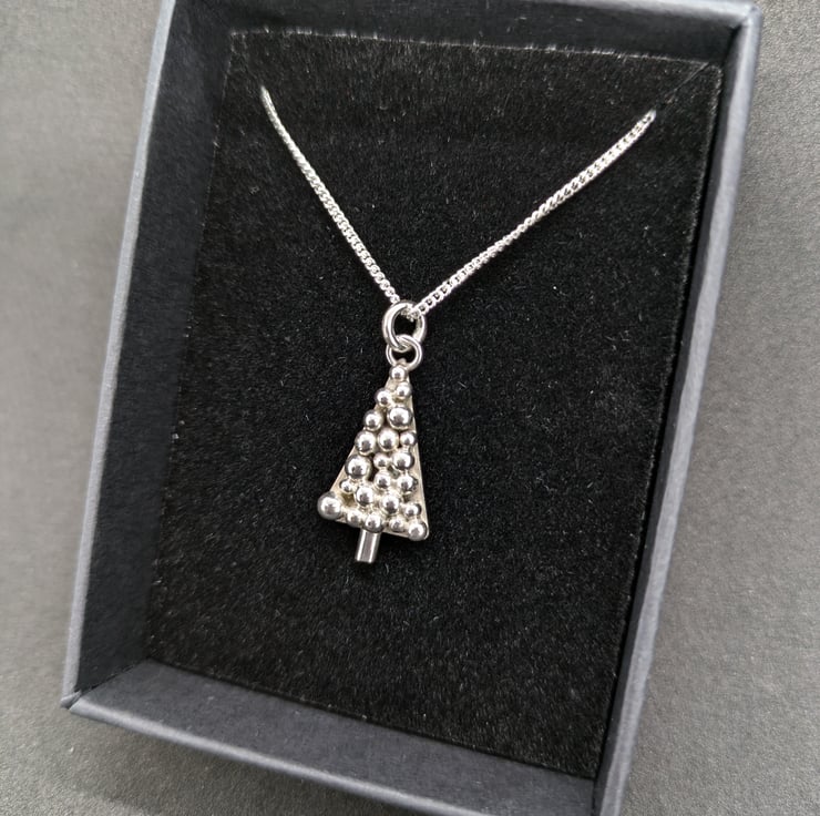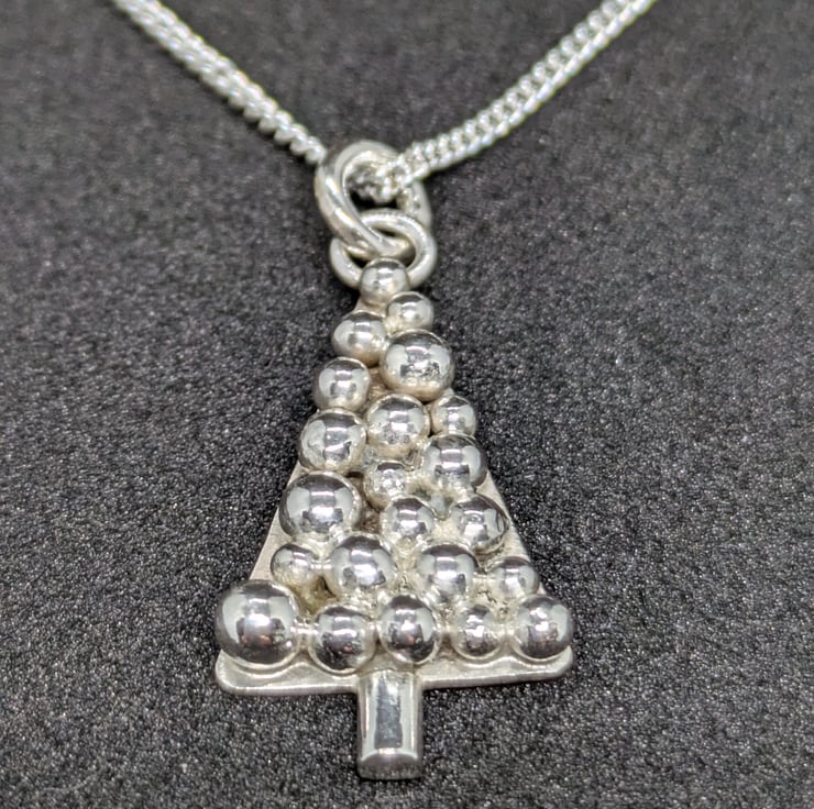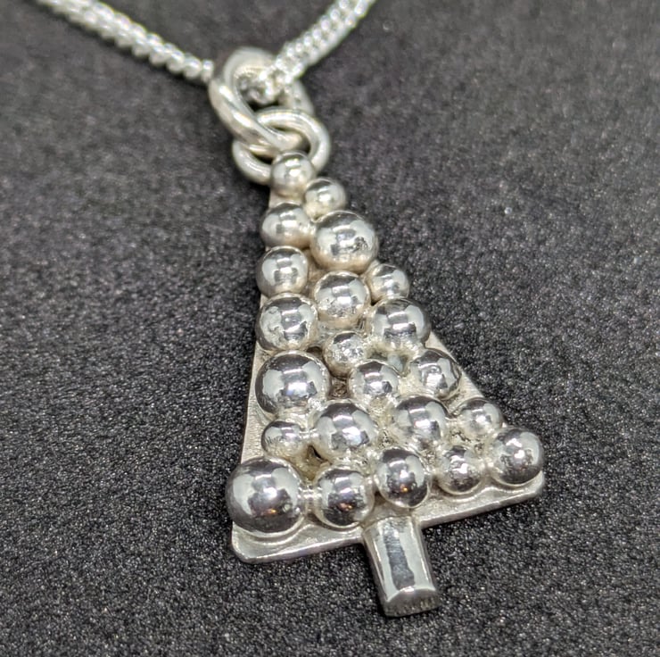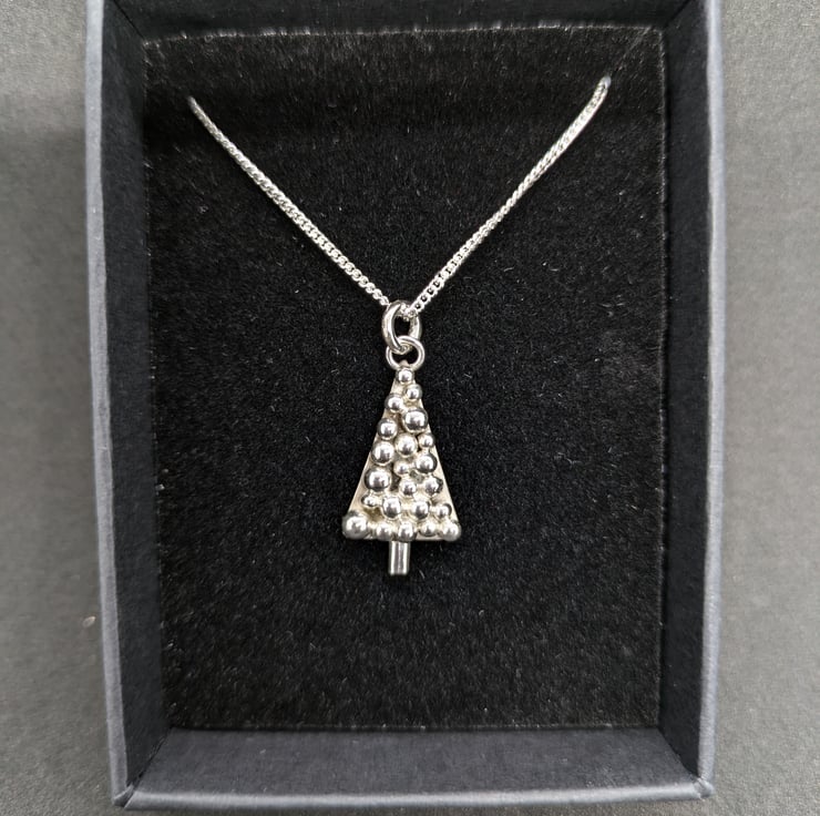 This sweet sterling silver Christmas tree pendant has been hand sawn from silver sheet and a silver trunk added. I have made multiple granulated silver balls of different sizes and soldered them to the sheet to form shiny baubles. This unique pendant measures approximately 2.2cm and hangs from an 18 inch curb chain. It is a simple but effective festive pendant.