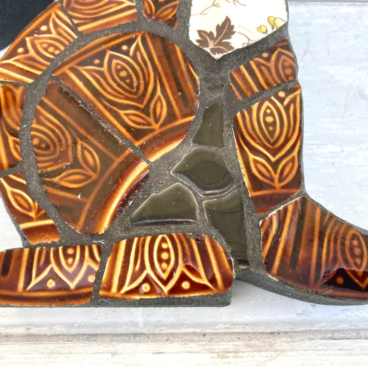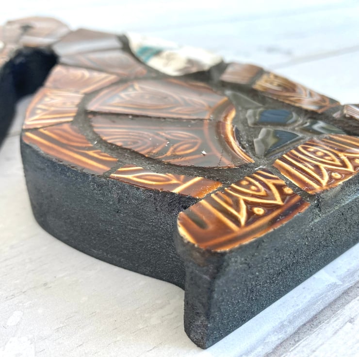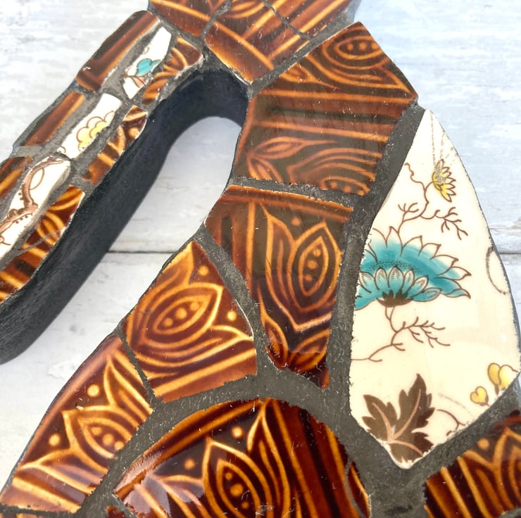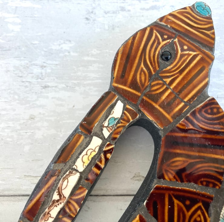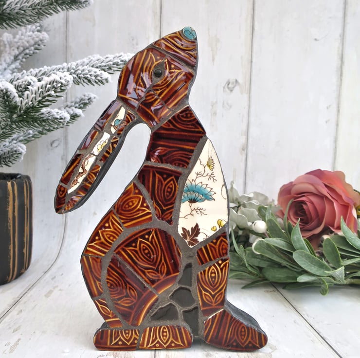 Handcrafted from recycled and repurposed textured 'Tam' vintage plates, this one-of-a-kind retro mosaic hare has a handmade, rustic style. This unique decoration would make a special and thoughtful gift or keep as an original piece of art for your home decor.