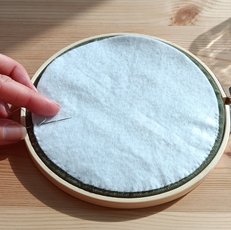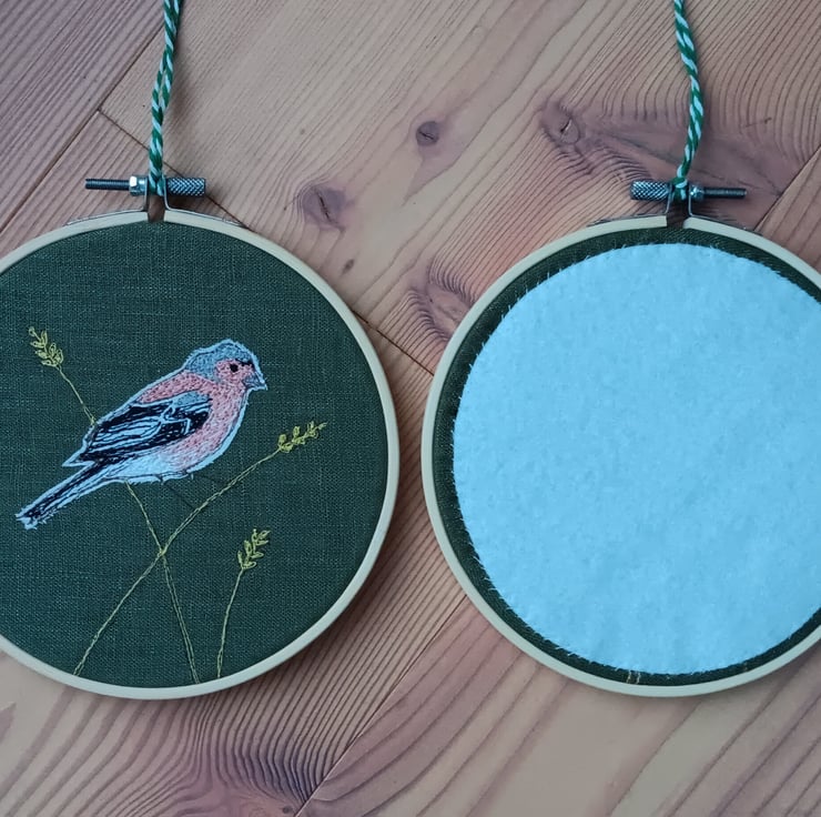 A beautiful and detailed free motion embroidery of a chaffinch and grasses. The design is made by combining appliqué and freestyle machine embroidery, and, by using different coloured threads, details are added to the chaffinches plumage. The embroidery is sewn onto a gorgeous forest green linen, which is then stretched into an embroidery hoop. The back is neatened by hand sewing on a circle of white felt. A green and white stripy string is added to hang it by.