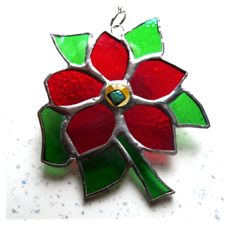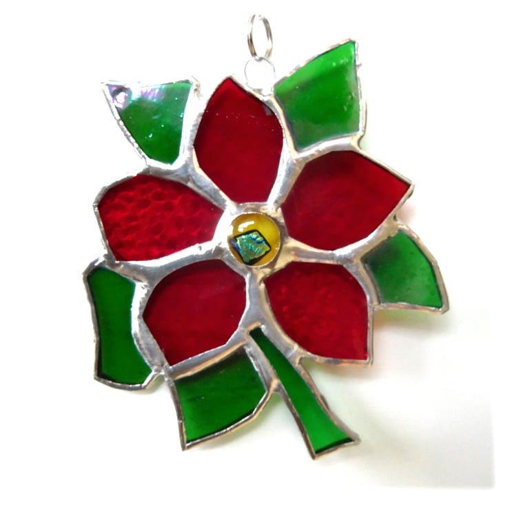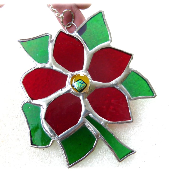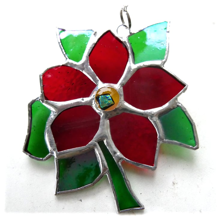 It is a gorgeous red clematis flower made with lovely glass and with bright green for the leaves and an exquisite little dichroic glass nugget I fused in my kiln in the centre.