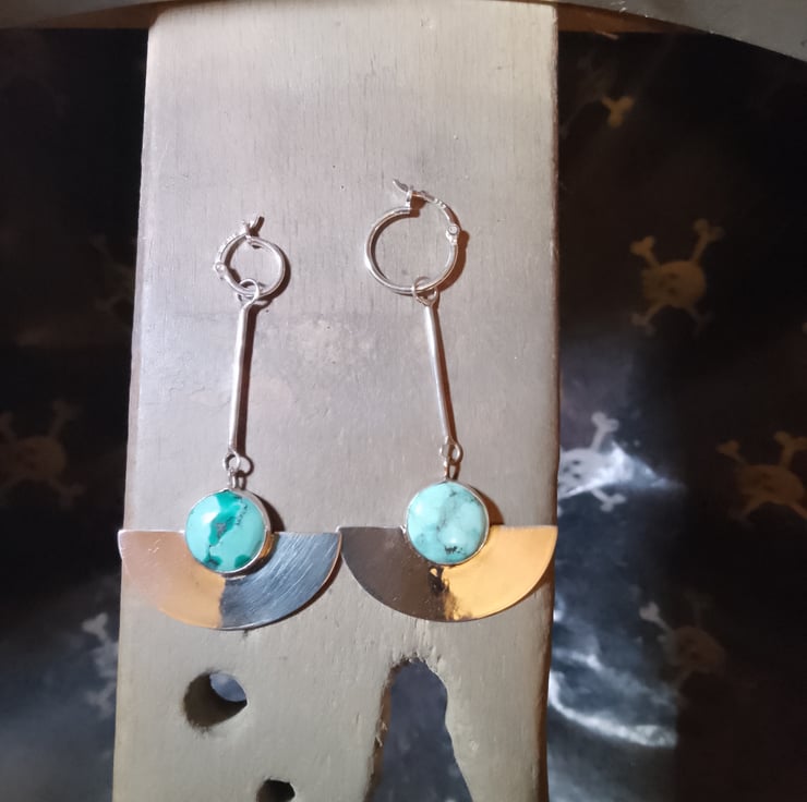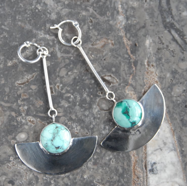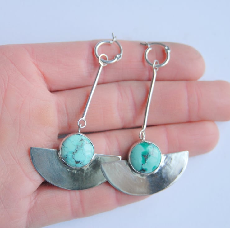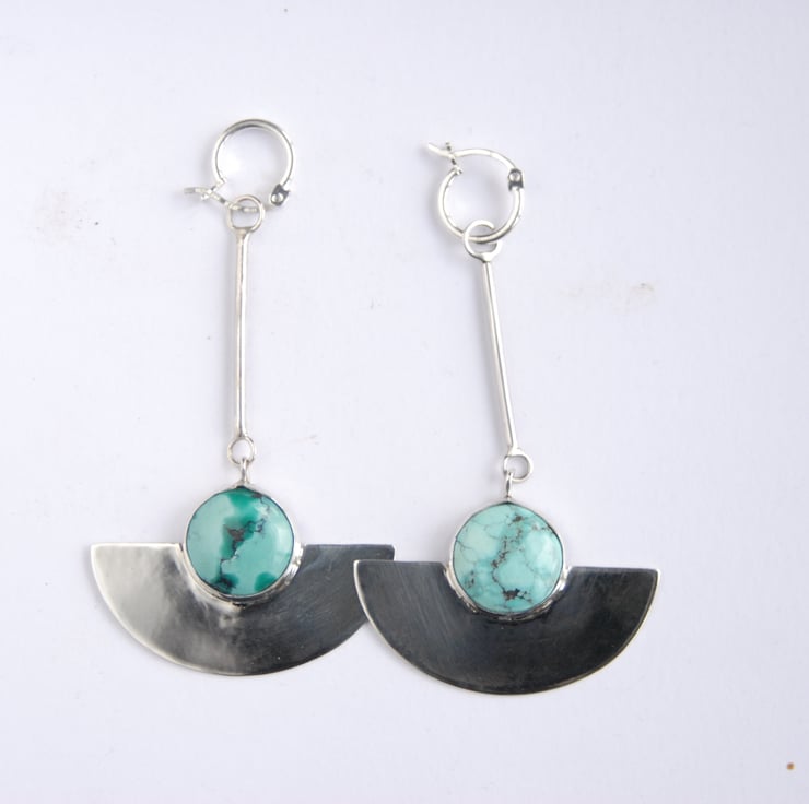 Turquoise and sterling silver art deco inspired earrings. Total drop 70mm, width 40mm. Tibetian turquoises approx 14mm diameter, hoops 10mm diameter.