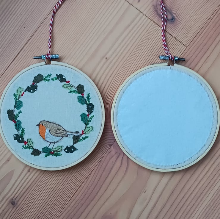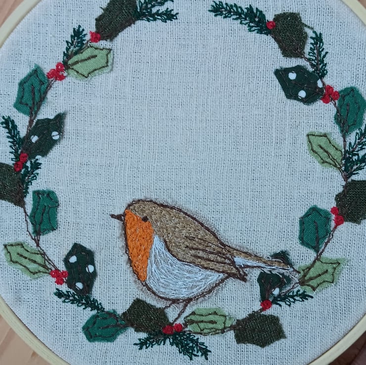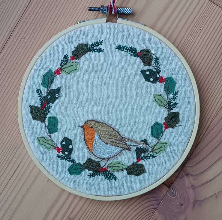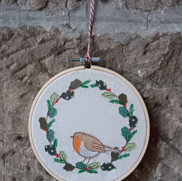 A beautiful embroidery in a hoop, depicting a robin surrounded by a wreath of holly and pine branches, to hang up and make your home feel very Christmassy.