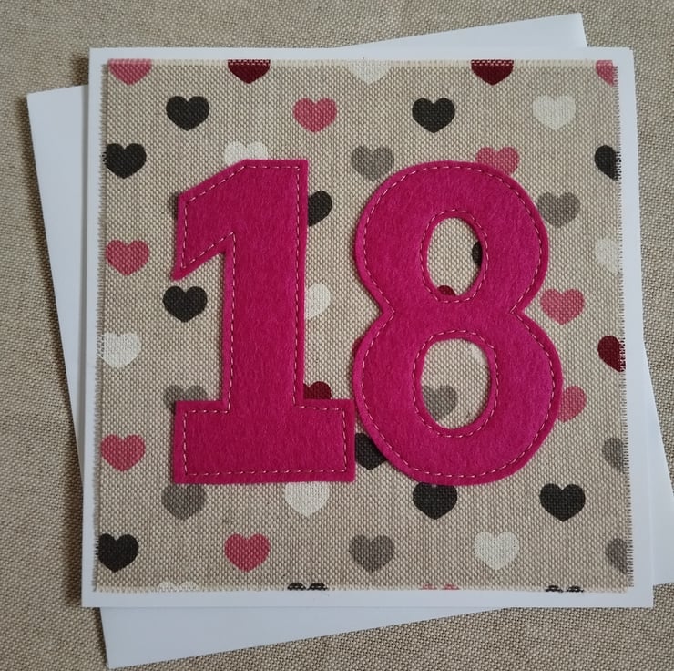 Linen look fabric with hearts has a coordinating felt 18 sewn on to it. This is a deep pink 18. The card measures approx 14.5x14.5cm and is blank inside.