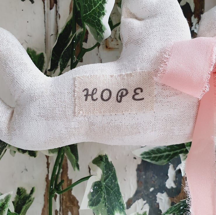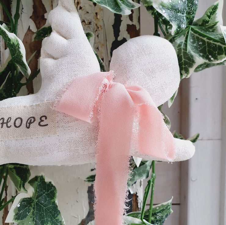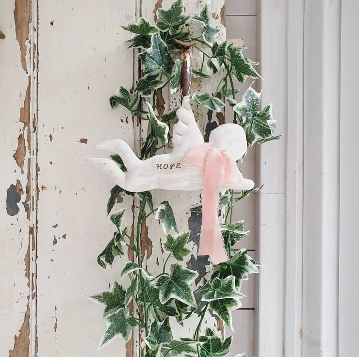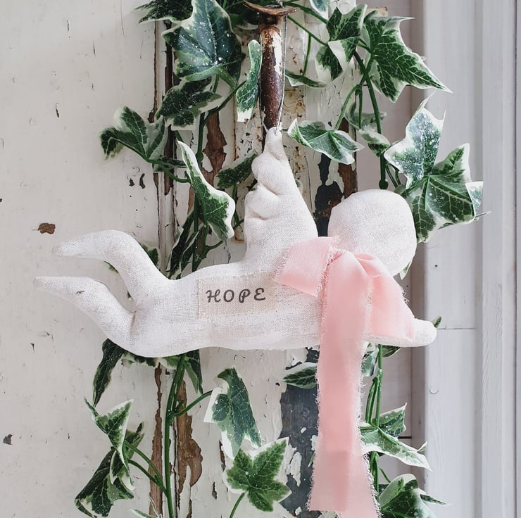 This is a primitive style cherub Christmas decoration. The fabric has been painted white and sanded down to give it an aged wooden effect. A pale pink chiffon ribbon has been tied around its neck and a handmade label with the words "Hope" have been stitched to its side. The hanger is made out of silver twine. It would also look good in your home all year round.