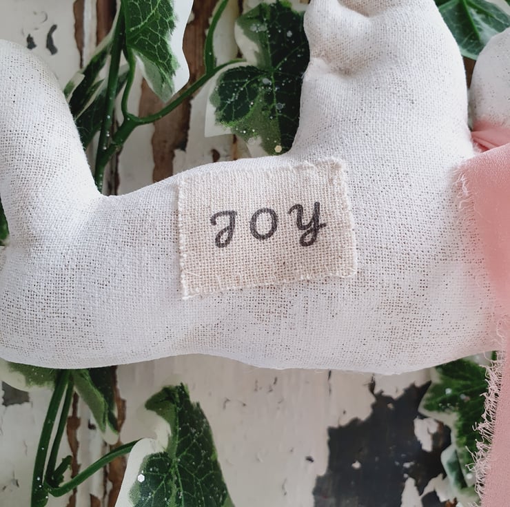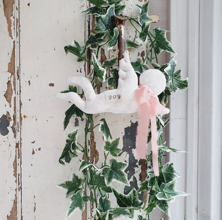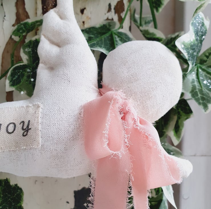 This is a primitive style cherub Christmas decoration. The fabric has been painted white and sanded down to give it an aged wooden effect. A pale pink chiffon ribbon has been tied around its neck and a handmade label with the words "Joy" have been stitched to its side. The hanger is made out of silver twine. It would also look good in your home all year round.