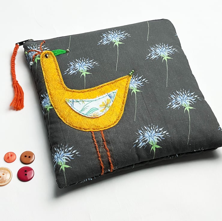 I have made this bag/pouch in my own thistle print on black cotton. The pouch also has an appliquéd bird on one side in orange felt with beaded highlights. The lining is cut from an up cycled silk scarf and the zip is black. I have added an orange coloured wool plaited zip pull.