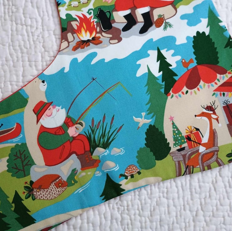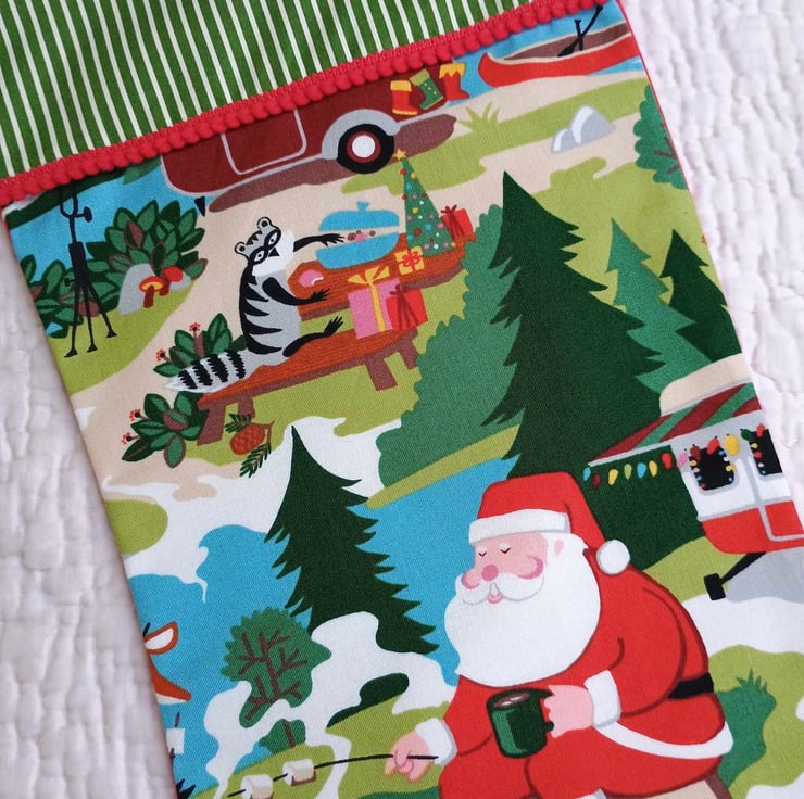 The front of this stocking features Santa camping in the woods with his reindeer. Made by hand, each will be a little different based on how I cut the fabric. You may get Santa fishing, toasting marshmallows or gazing at the stars (or flying reindeer) as the prominent image. And the little critters vary too - you could get a cheeky racoon, or a perky squirrel. Add a note to your order if you have a special request and I'll see what I can do.