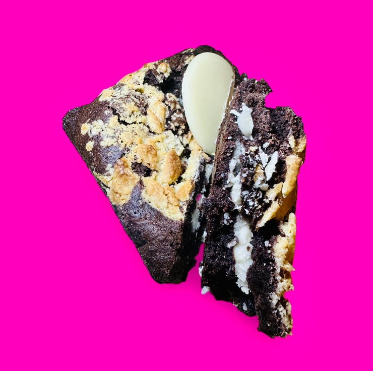 Discover our signature triple-layer brownie, lovingly handcrafted in small batches in our British kitchen. Each brownie combines a rich Belgian chocolate base with a smooth white chocolate filling, crowned with giant white chocolate buttons.