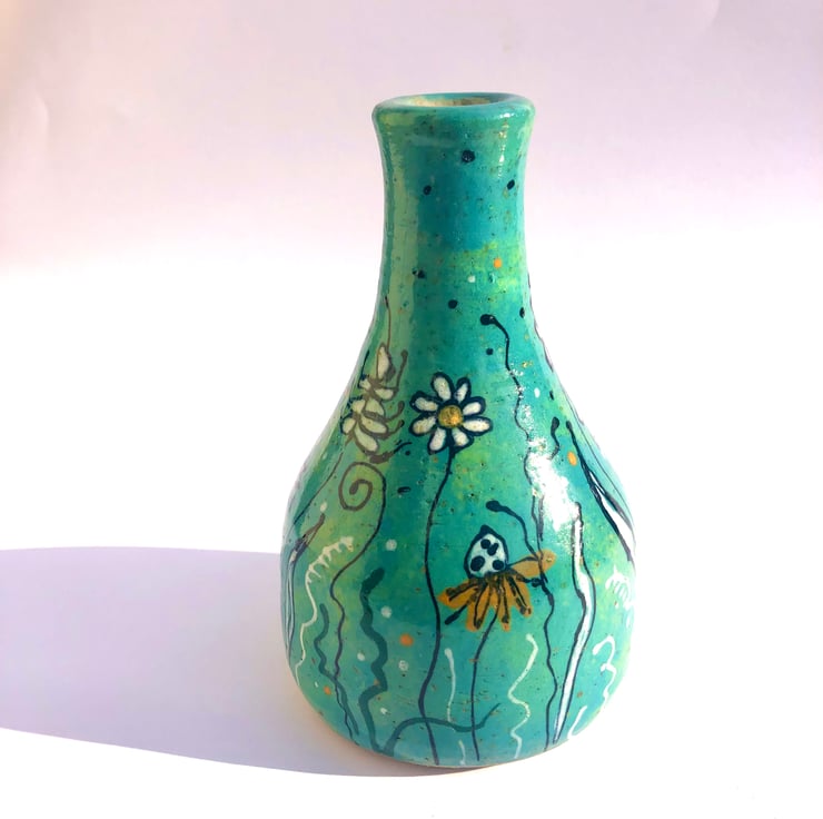 This 14cm high stoneware ceramic vase features a loosely drawn meadow with flowers, grasses and seed heads on a turquoise and teal background. Great for a couple of blooms from the garden or some dried seedheads this vase would make a lovely gift for a whole variety of occasions. It will be supplied in a sturdy box and dispatched promptly.