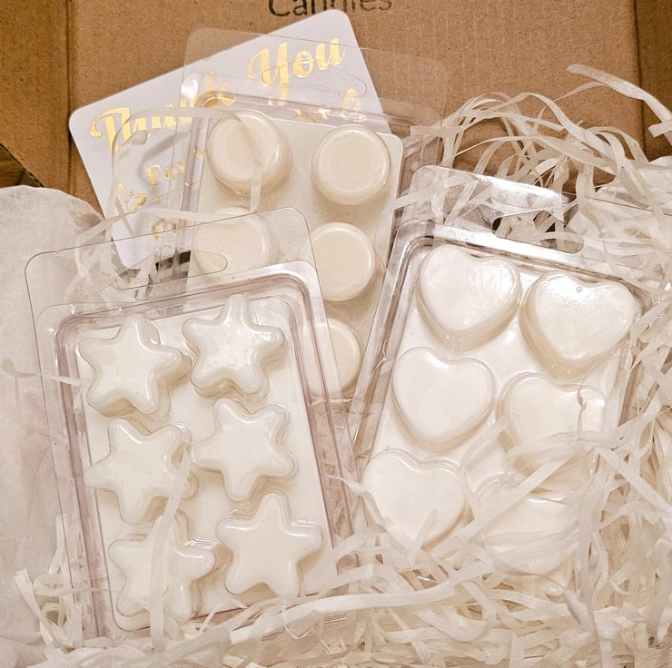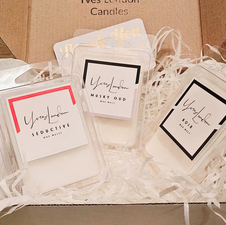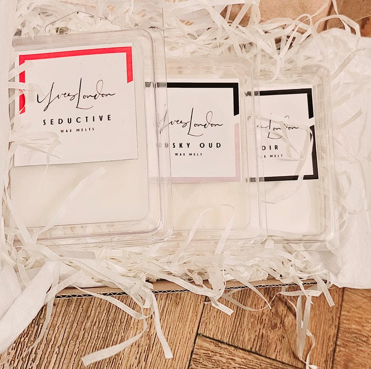 Trio of best selling wax melts in clamshell packaging boxed and wrapped. Musky oud, Seductive and Opium Noir scent.