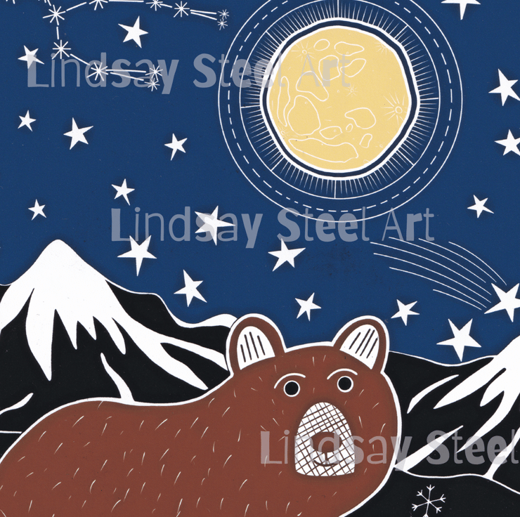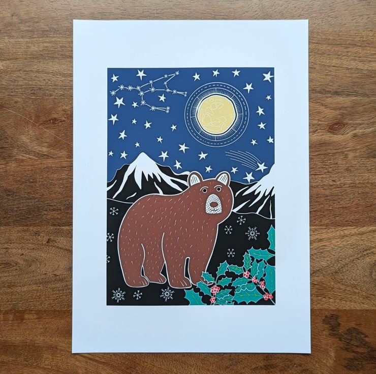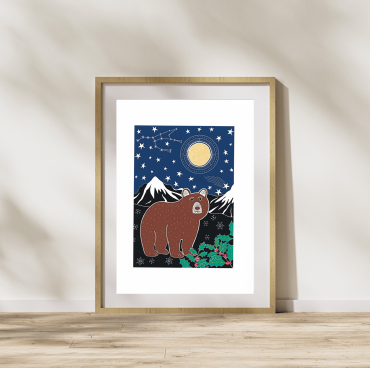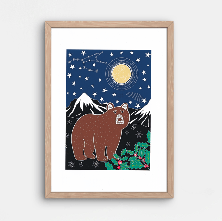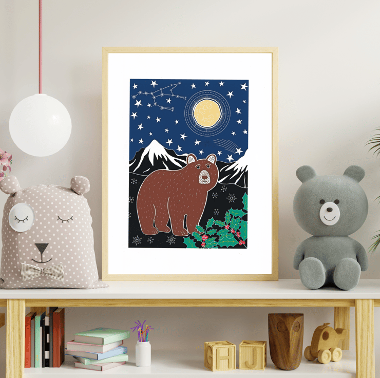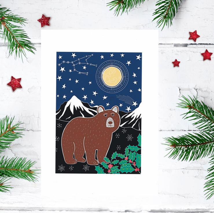 A print of my original digital painting Bear Loves Christmas. Tamsin the bear likes winter and she loves to gaze up at the full cold moon and the glittering stars (Ursa Major is her favourite).
