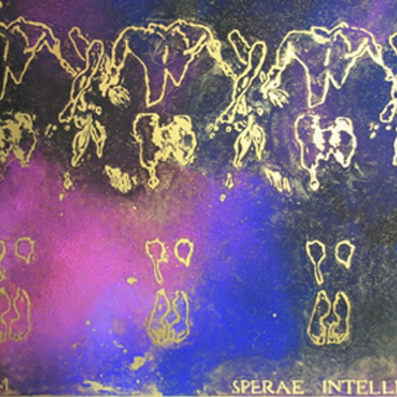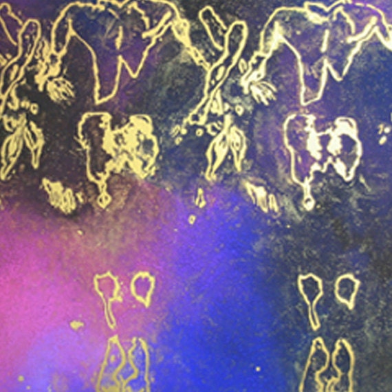 This print uses my unique signature style of printing onto paper prepared with gold and metallic paste. It looks back to the use of gilding in many forms of medieval art.