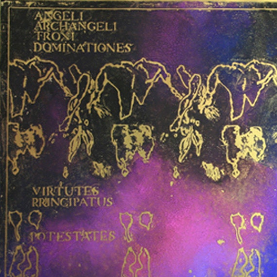 A very large woodblock print, This is one of a series of images based upon the medieval concept of the soul ascending through the Spheres of existence towards God. Medieval cosmology mapped existence as a mirrored, multi-levelled universe of downward descent into increasing levels of matter and an upward ascension of increasing spirit.