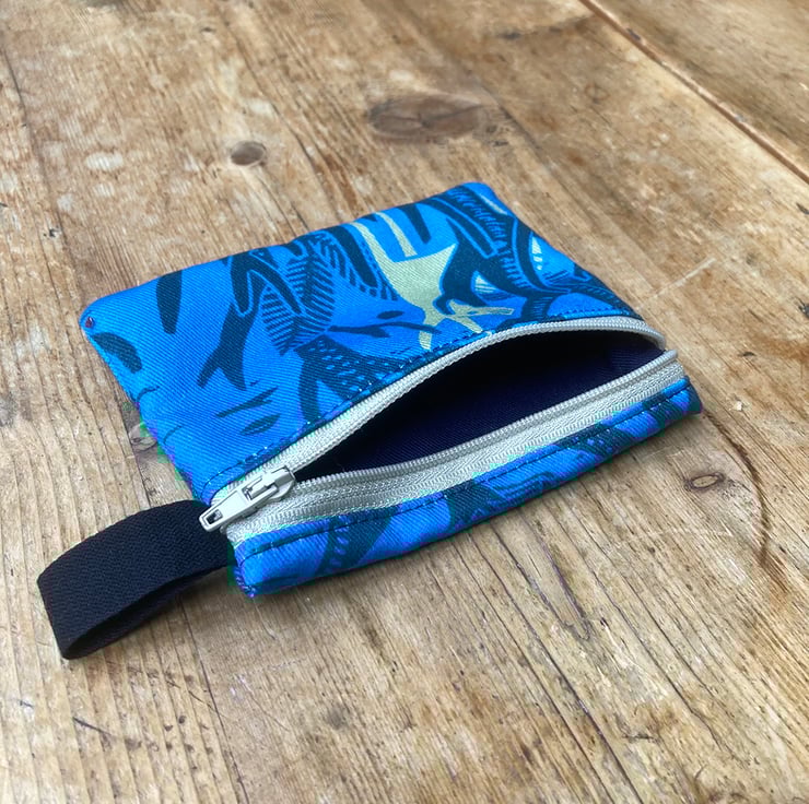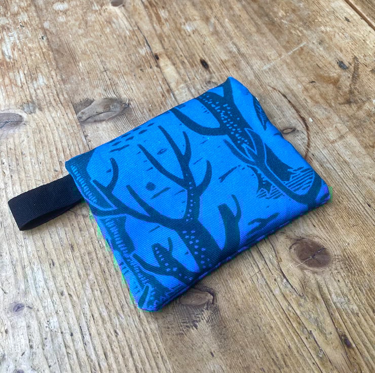 100% cotton handmade lined purse with zip fastening. The fabric is printed with a repeat pattern entitled ‘The Donkey Woods’ in blue, grey and cream.