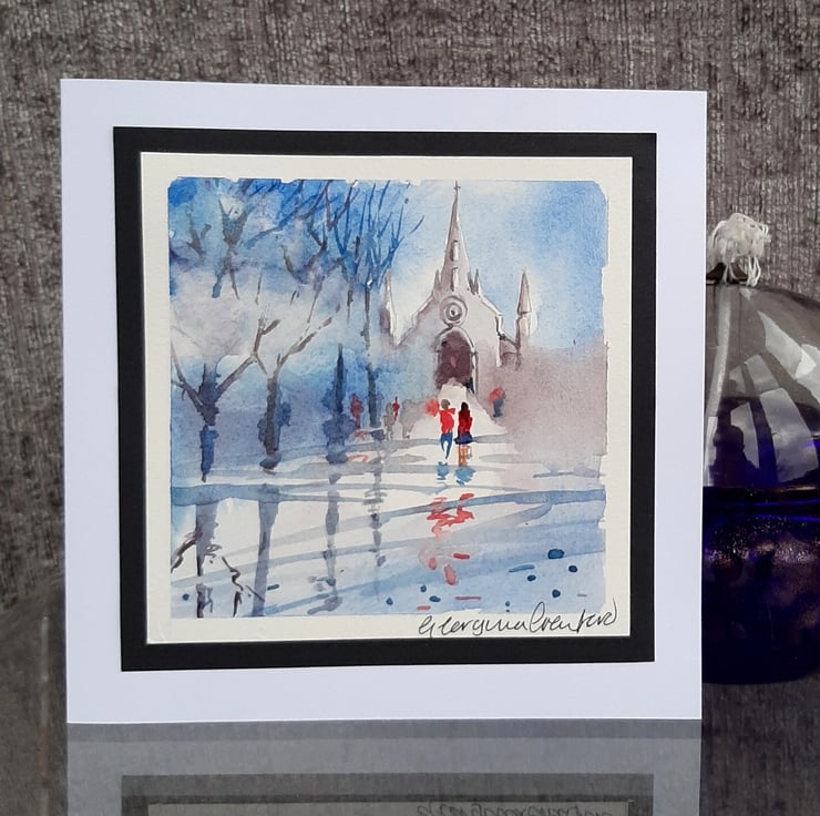 Beautiful handpainted watercolour card of trees on a rainy day.