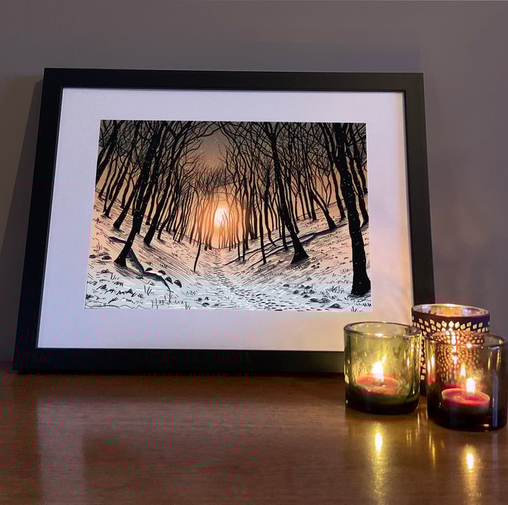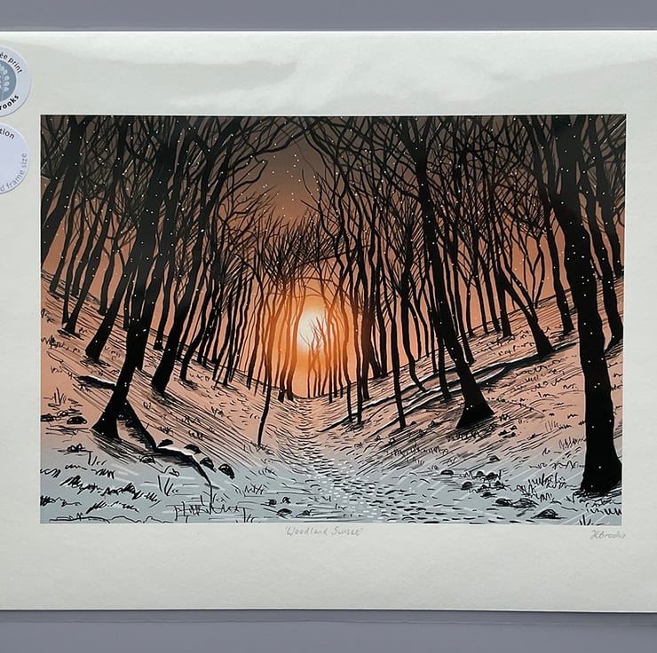 'Woodland Sunset' - an open edition, fine art giclee print on Hahnemuhle 290gsm Agave eco paper. The image is created by drawing directly onto an iPad using Procreate.