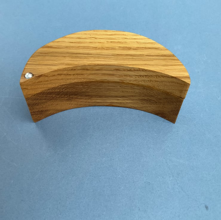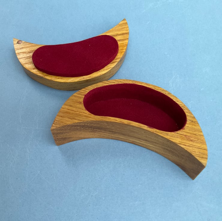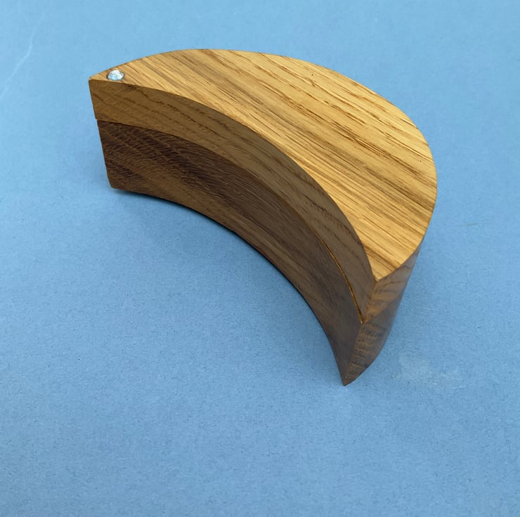 A beautiful solid oak wood jewellery / trinket box finished in a light satin sheen in the shape of a cresent moon decorated with a single rhinestone. The interior of the box is finished in a soft, dark red flocking.