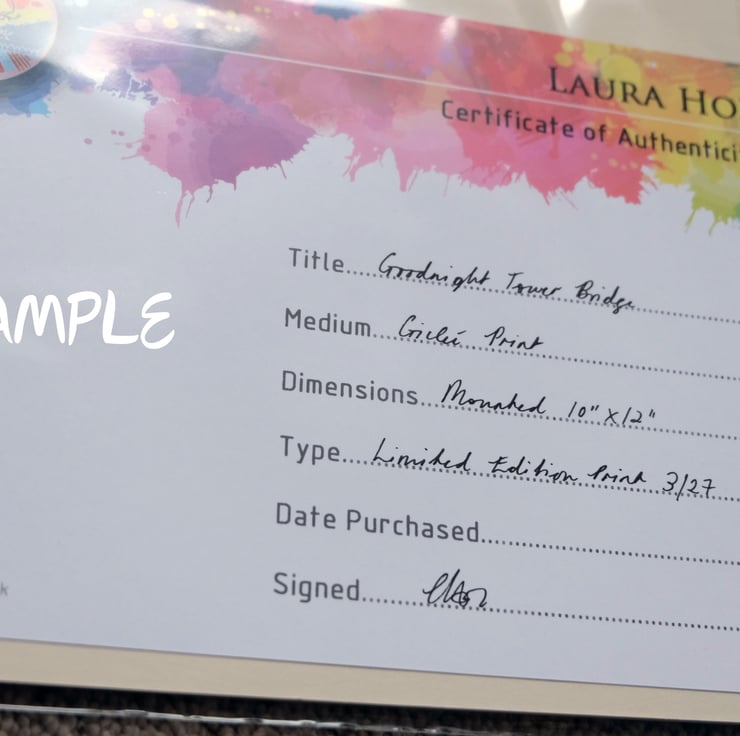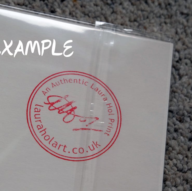 Authentication: The print is signed, named and numbered with the edition number and print run. It comes with an Authentication Certificate containing purchase information, and an identifying Laura Hol print original print stamp on the back of the mount. A disclaimer is also included to guard against copyright fraud.