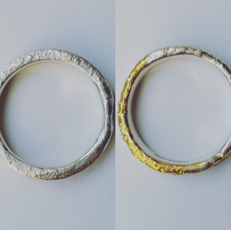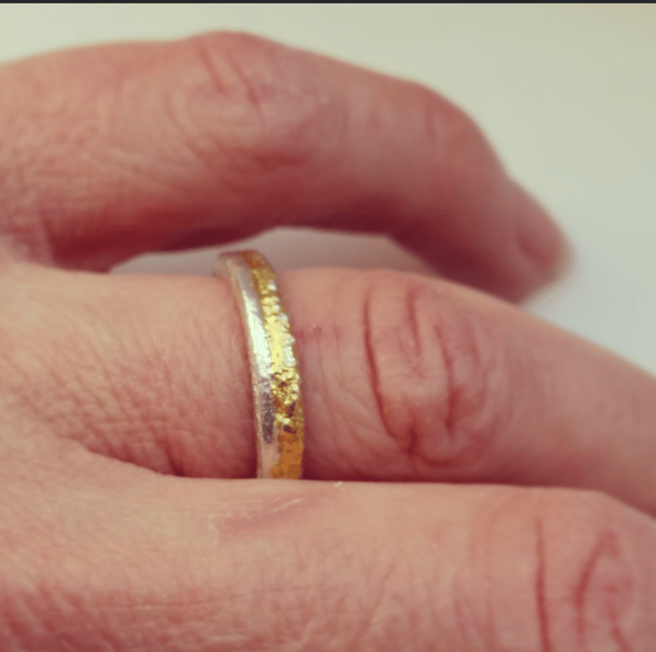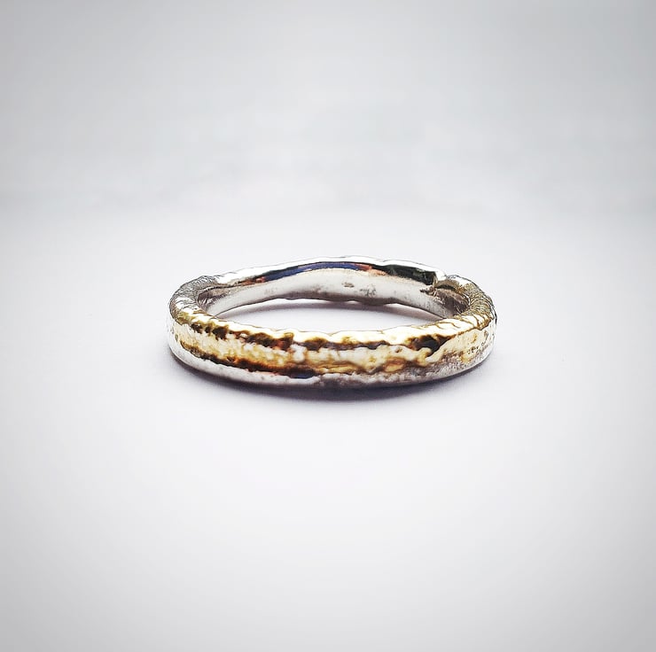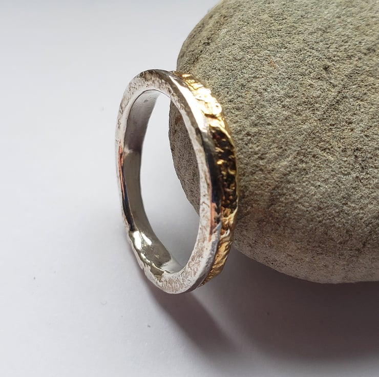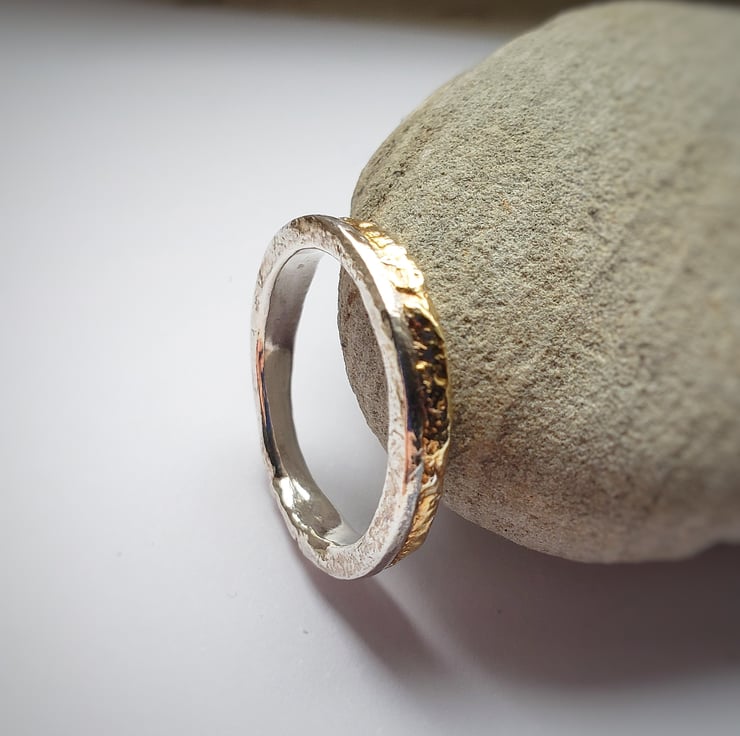 The ring is made of sterling silver which is part smooth silver and part textured which had been highlighted with 24 carat gold to create a stunning contrast. Smooth on the inside and irregular and distressed on the outside this ring has been made as a one off and is not available as a commission.