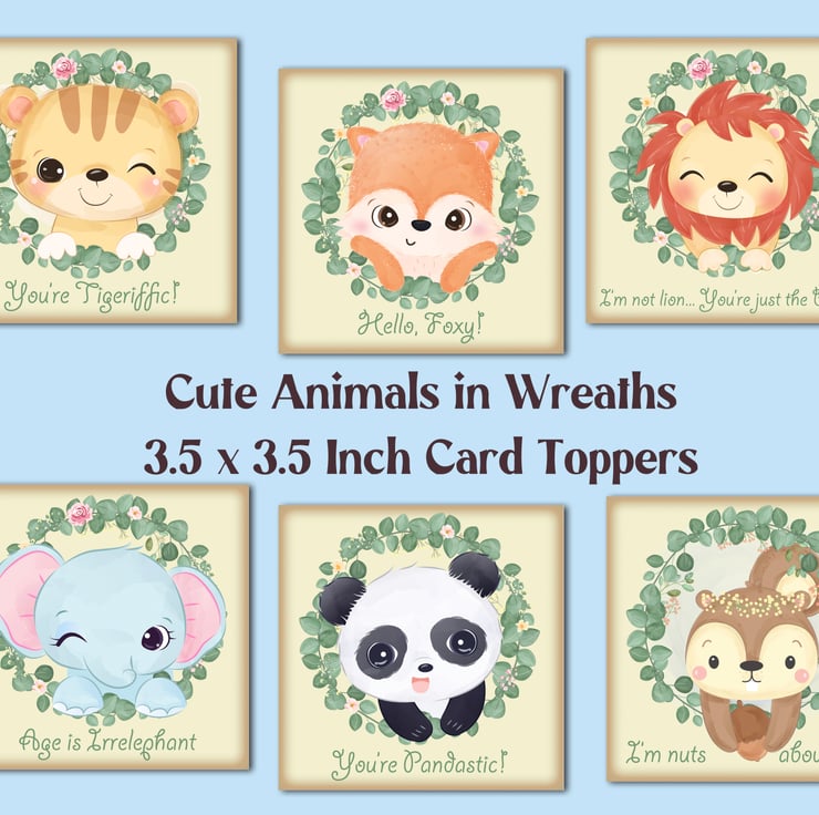 A set of six 3.5 inch square card toppers - Cute animals in wreaths. Each one has a different phrase: