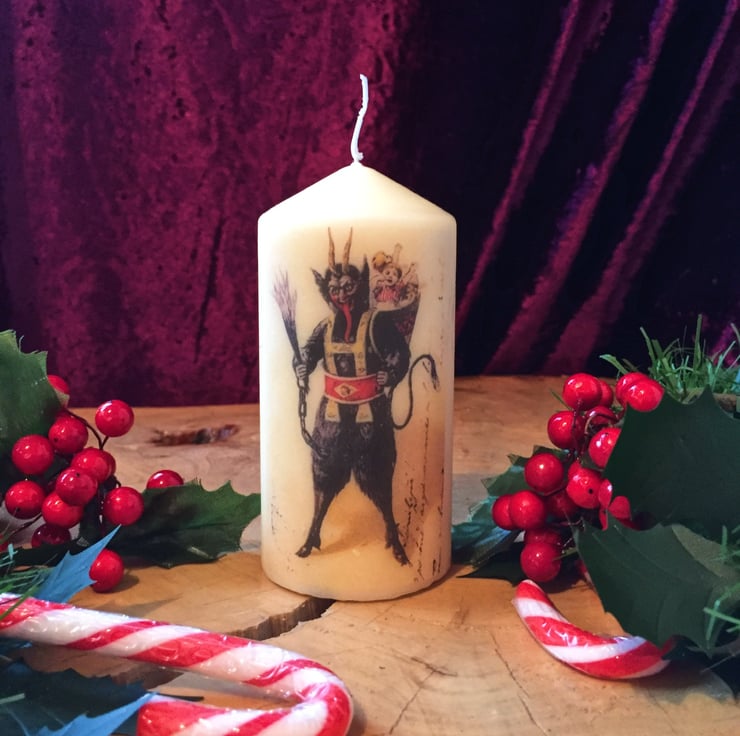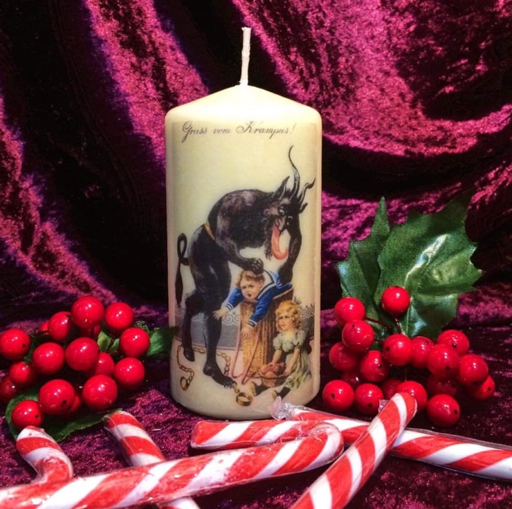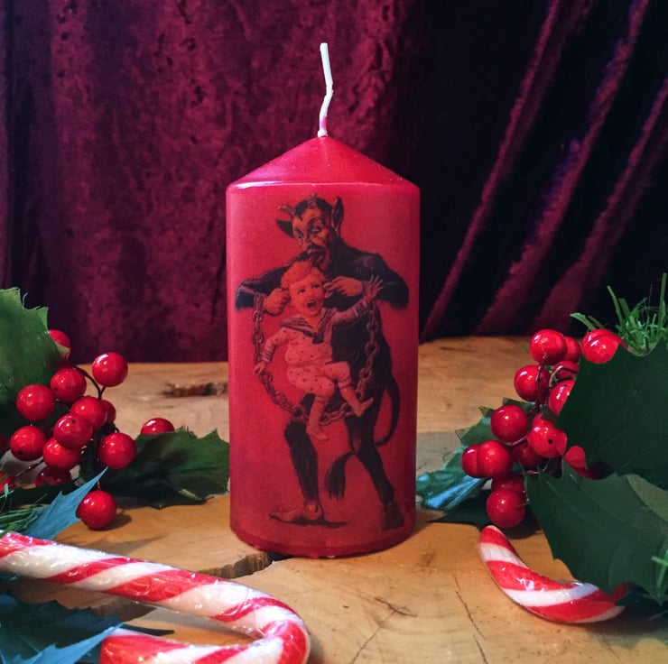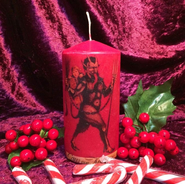 The Christmas Devil inspires these festive candles, which is a German folklore Krampus He was created as a counterpart to kindly St. Nicholas, who rewarded children with sweets. Krampus, in contrast, would swat "wicked" children and take them away to his lair if the children misbehaved