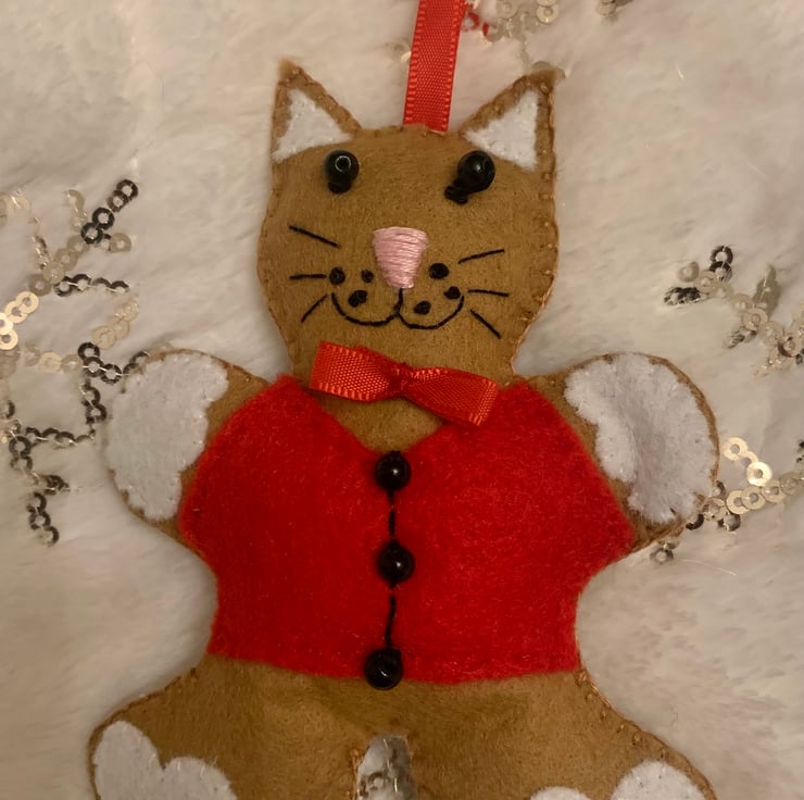 A sweet little felt gingerbread cat, handmade to an original design and ready to hang on your Christmas tree. Hand embroidered detail on the front of the design. Approximately 11cm tall with a red hanging ribbon. Lightly stuffed with toy filling.