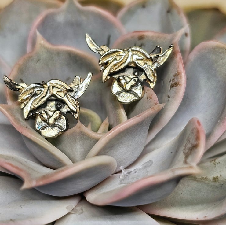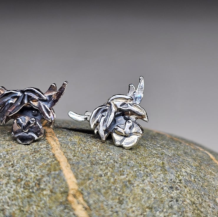 These wee guys are made from sterling silver sheet, layered up to give depth. They have been hand sawn and textured (through the use of metal tools to provide different marks). They have then been produced through a lost wax casting technique, finished by hand and oxidised to bring out the detail.