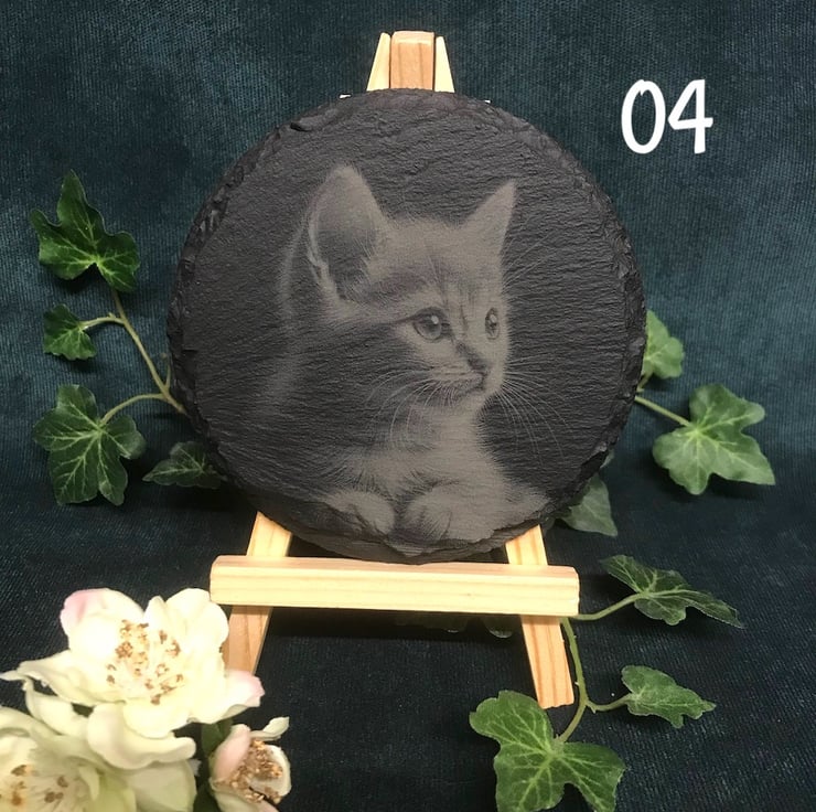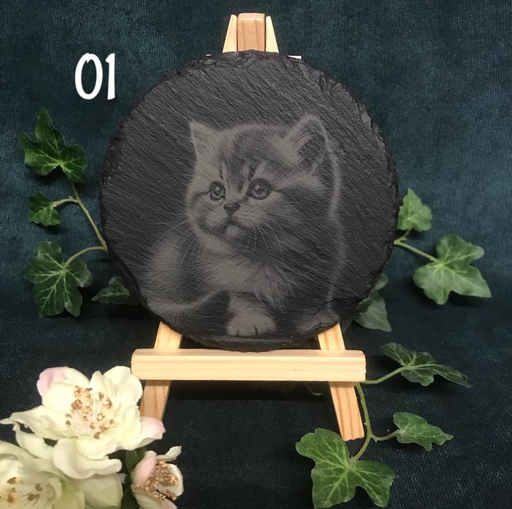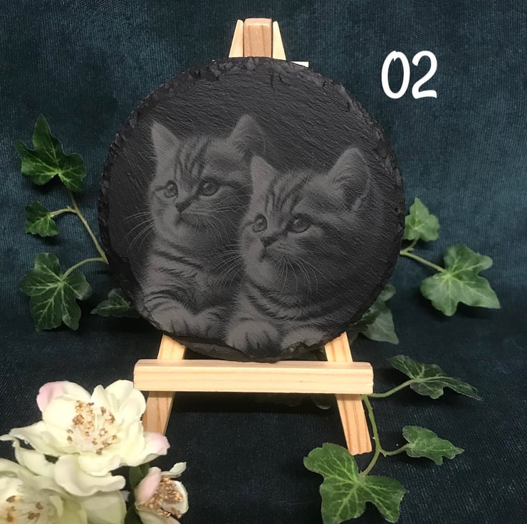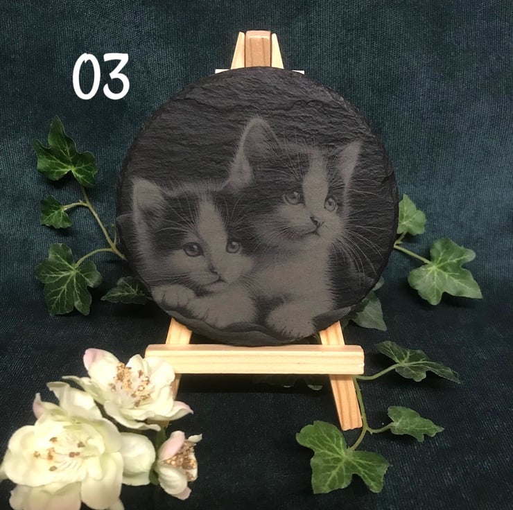 Dreamy kittens on round rough edged slate coasters. These pencil sketch style images are laser engraved, a cute birthday gift for a cat lover or as cat inspired home decor for a new home gift .