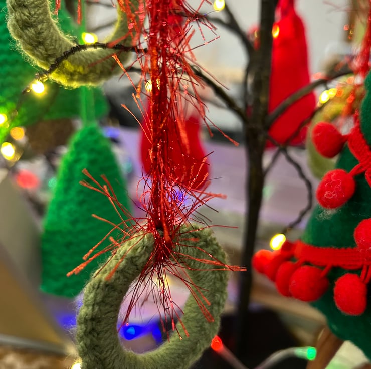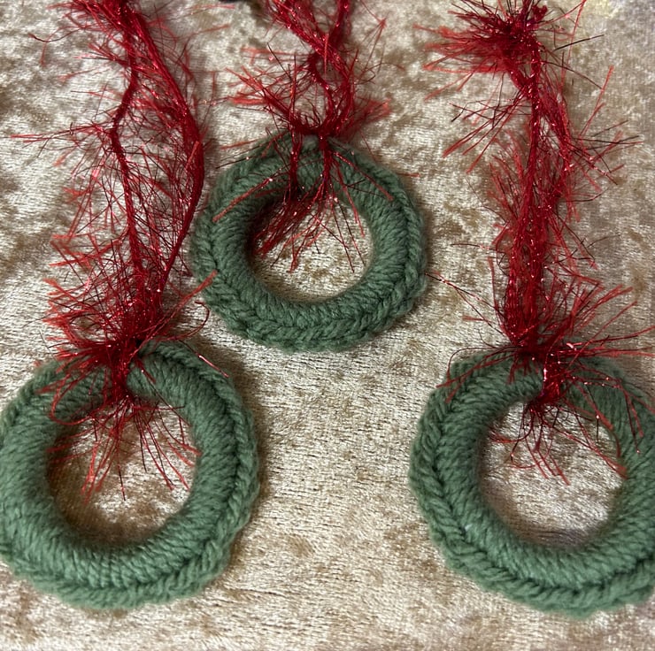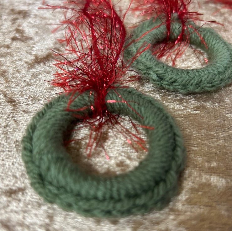 Handmade using upcycled curtain rings and with a sage green crocheted yarn complete with tinsel effect hanging thread.