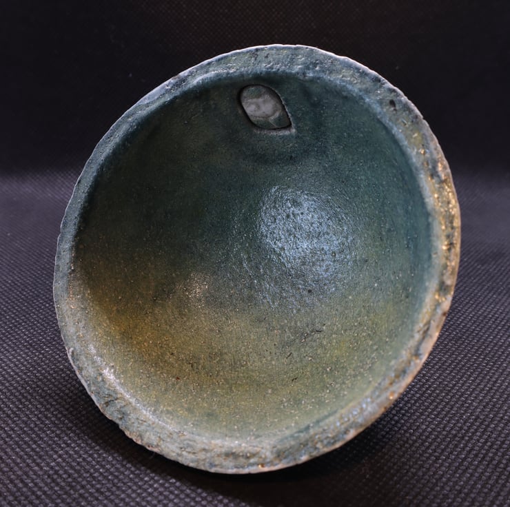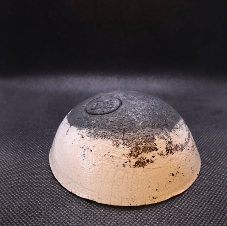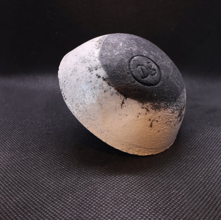 Handmade ceramic bowl. Made using the raku firing process. This involves exposing the glazed ceramic bowl to fire and a combustible medium (sawdust). The process results in each piece being totally unique. 9cm by 3.5cm. Not food safe.