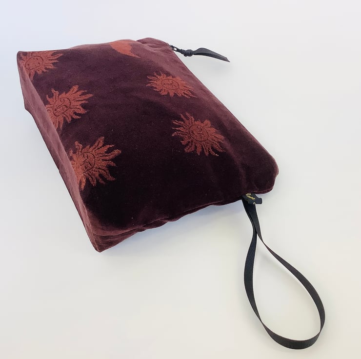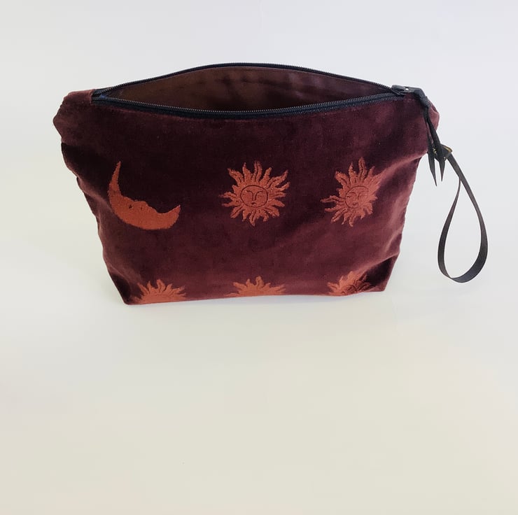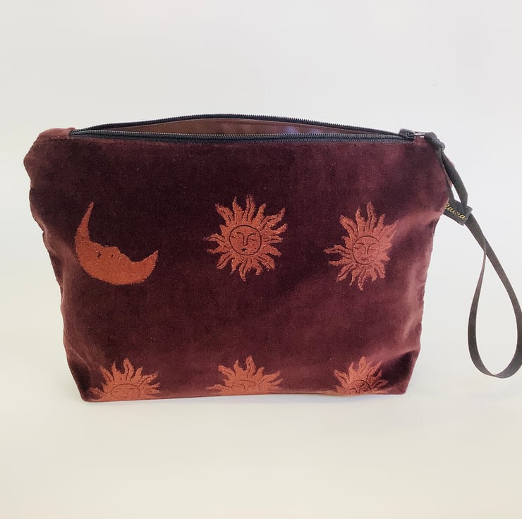 Indulge in luxury and make a statement with our Chocolate Sun and Moon Velvet Makeup Bag.
