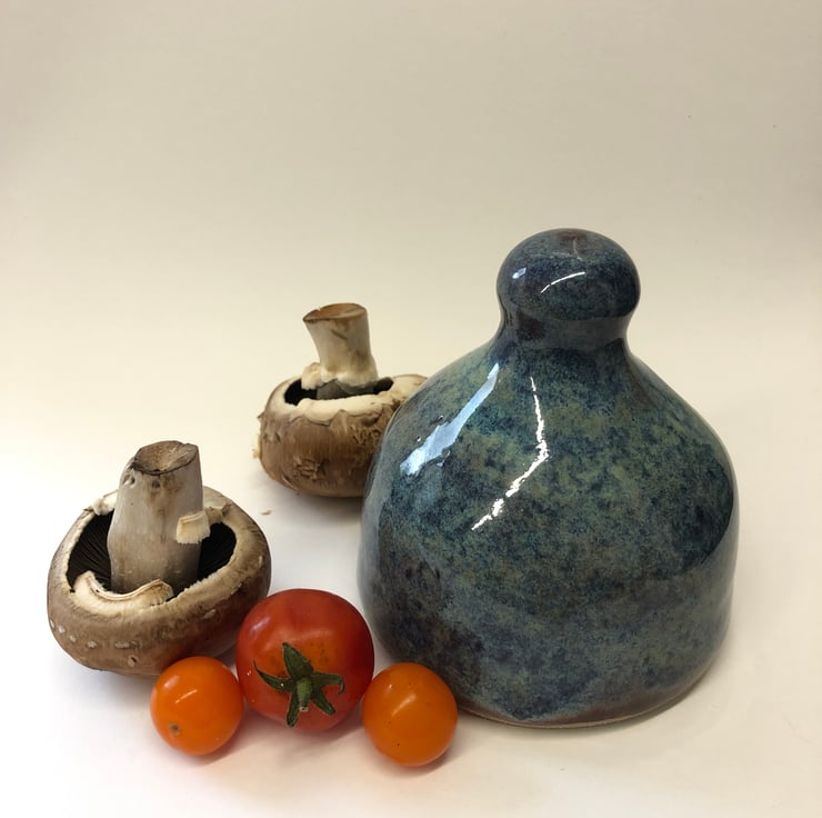 This wheel thrown stoneware ceramic salt pig has been finished with a beautiful ocean glaze, mottled with blues and greens and a lovely toasty finish around the rim. The inside is glazed with a deep burgundy colour. It measures approximately 11 cm tall x 10 cm diameter at the base and comes with a small wooden scoop. Dishwasher safe.