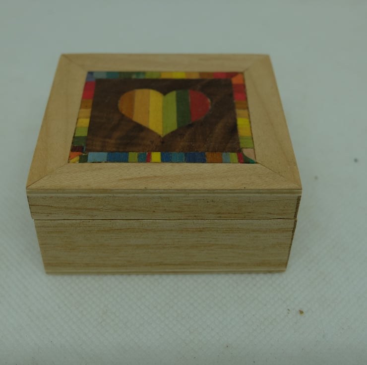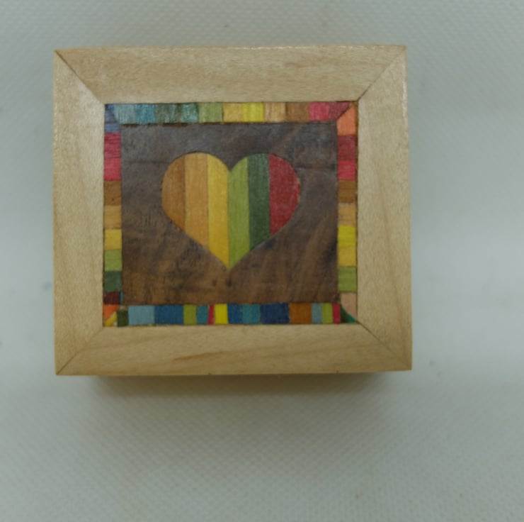 I love small boxes and had fun veneering this one with a rainbow heart surrounded by a rainbow border.
