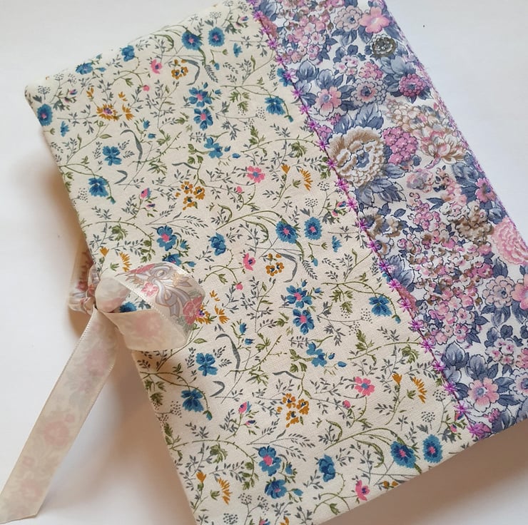 This range of work is entitled Taking Libertys with Others - this is a pink patchwork covered notebook, with a ribbon tie at the side. Hope you will check out the blue ones I have also listed.