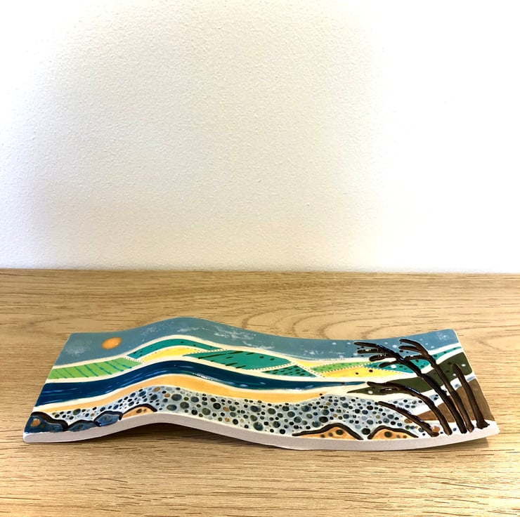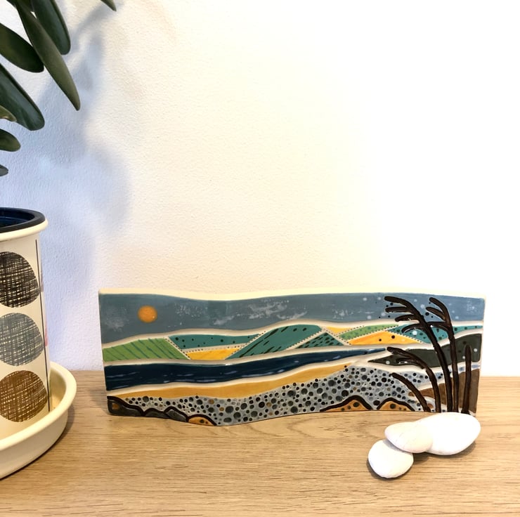 This 24x8cm ceramic stoneware landscape wave looks great as a feature object standing on a shelf or mantlepiece. The incised clay design features the pebble ridge, beach, sea and river estuary near Westward Ho! Finished in earthy underglazes this piece would make a lovely gift for any folk who love this part of the North Devon coast or perhaps someone who has trudged this stretch whilst walking the beautiful South West Coast Path.