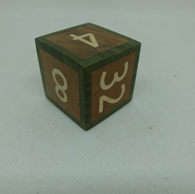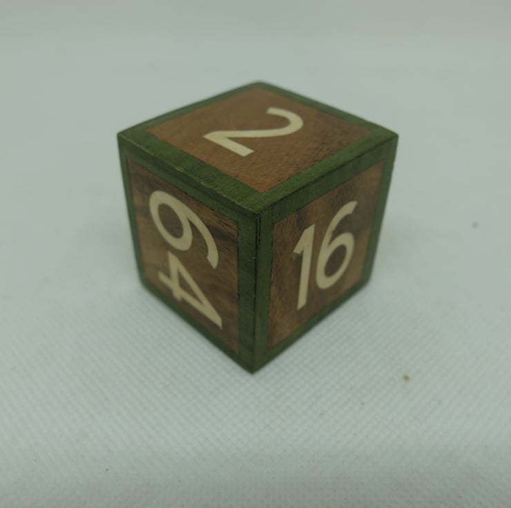 Doubling cube in wood with walnut background, green edges and light wood numbers.