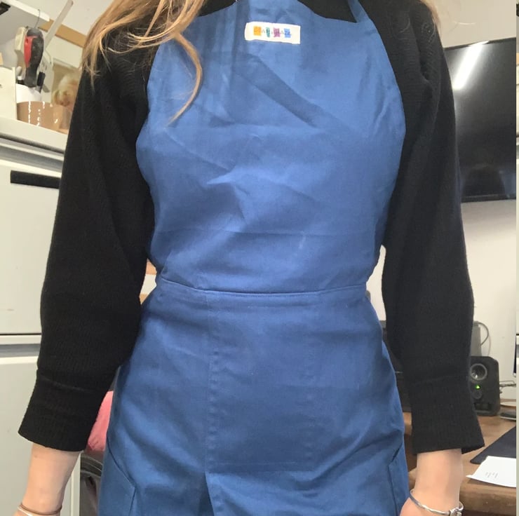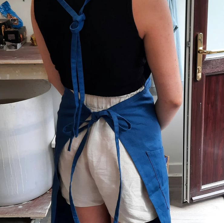 A split leg potters apron made from a hard wearing blue cotton with claynglaze branding. This apron has two large hip pockets. One size fits all. Adjustable straps.