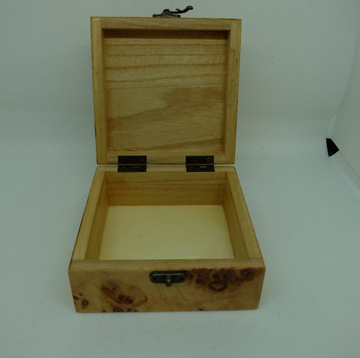 This is a lidded box, veneered in a light-coloured burr wood with a square design to the lid, bordered with black stringing.