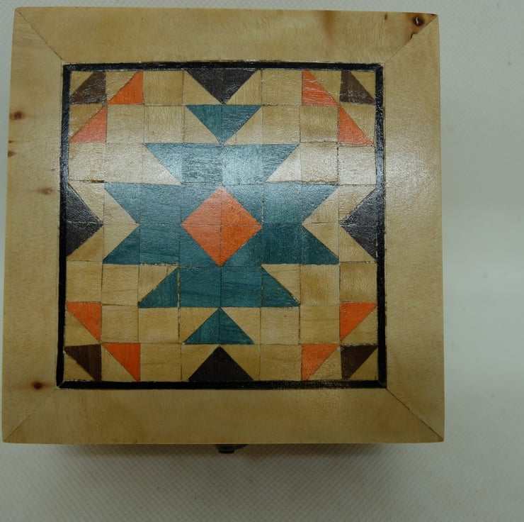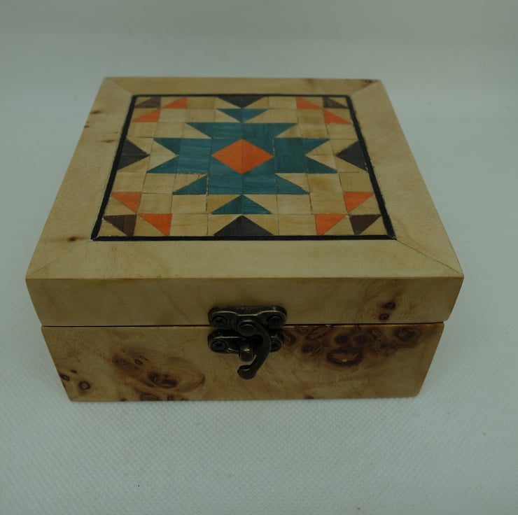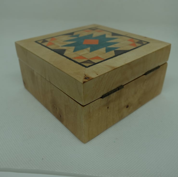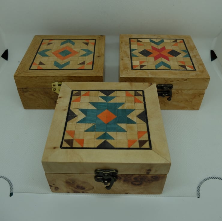 I was commissioned to make a large Navajo style box some time ago and continued to play around with the ideas. Small squares and triangles in various coloured wood veneers make up lots of traditional designs.