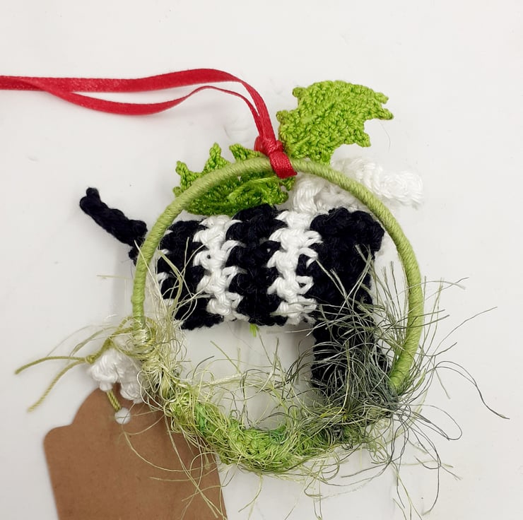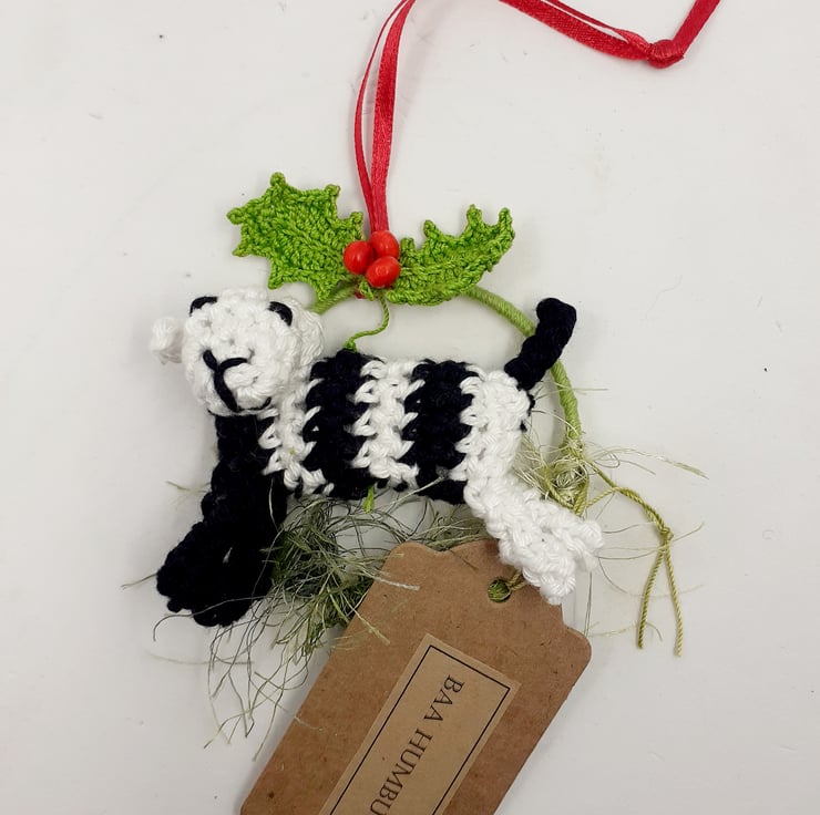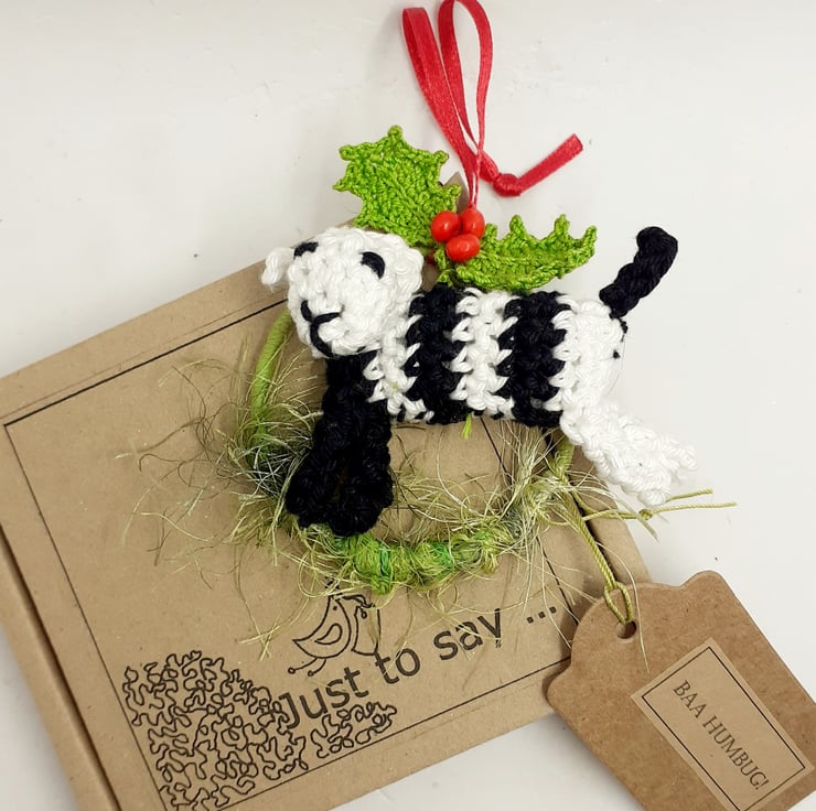 This fellow is grumpy but nevertheless all set to deliver a festive message on your behalf. The sheep is crocheted in cotton and filled with polyester stuffing. It is hanging from a metal hoop which has been wrapped in cotton and eyelash yarn. The hoop is embellished with a crocheted holly decoration ( nearly as prickly as tge humbug sheep) and the berries are painted wooden beads. The tree decoration has a narrow ribbon hanging loop and the tag reads ' Baa humbug!'. The decoration comes wrapped in tissue in a labelled PIP ( Postage in Proportion) box, all ready to be given or posted on. It would make a novel, keepsake alternative to a greetings card this year and a fun tree decoration for many years to come.