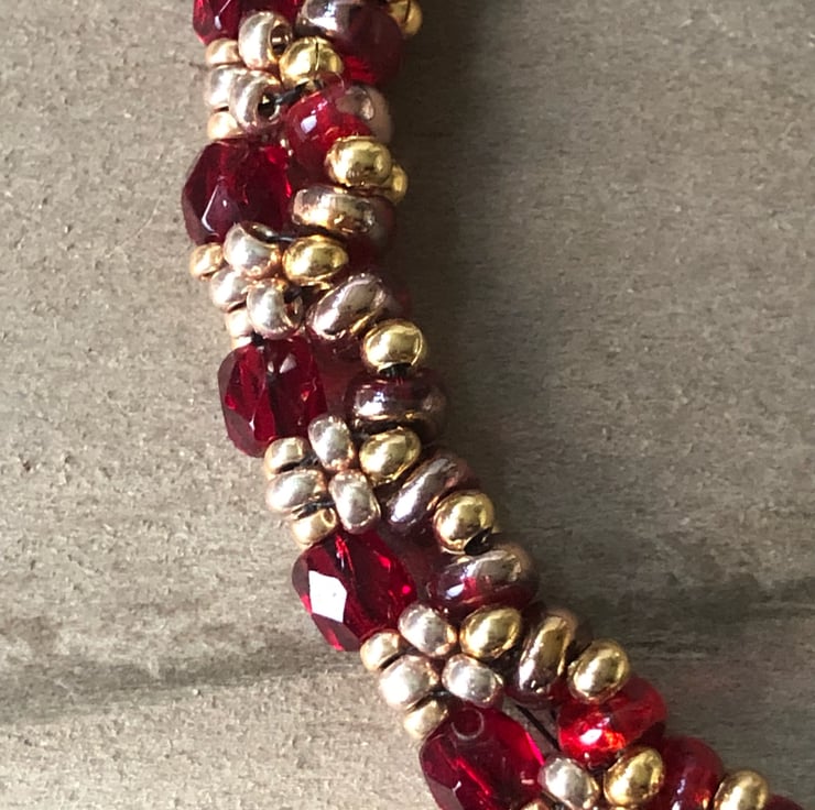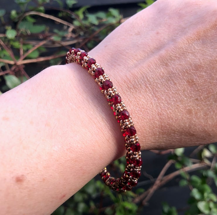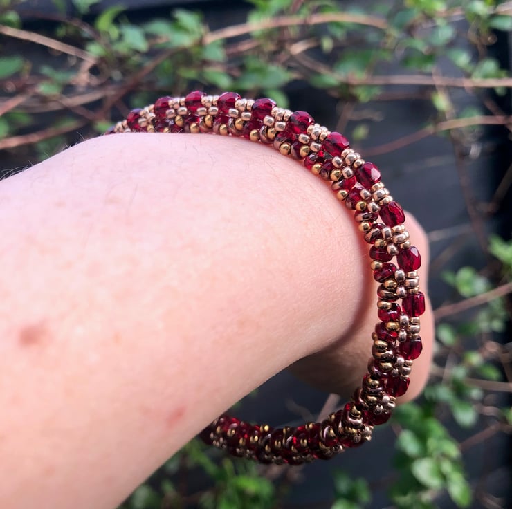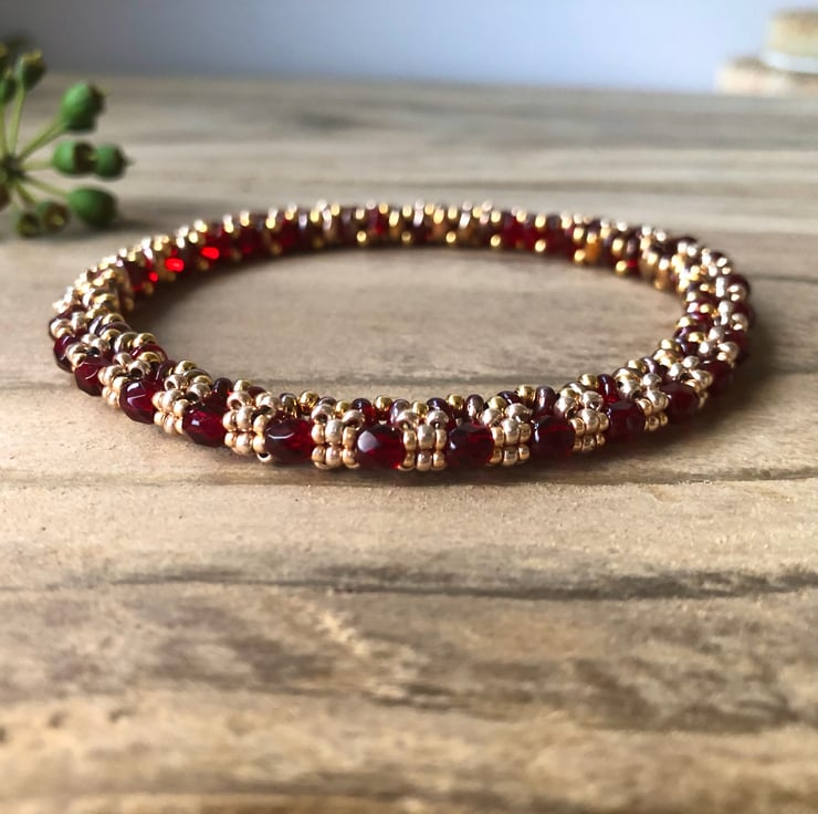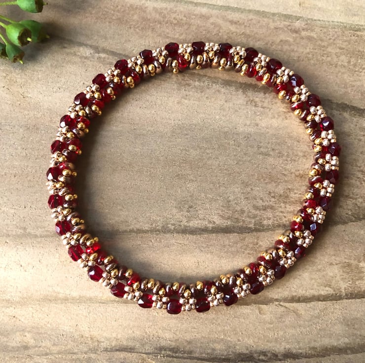 A deep red and gold beadwork bangle bracelet with Czech glass fire polished 'Garnet' crystals, red superduos and gold Japanese Miyuki & Toho seed beads.