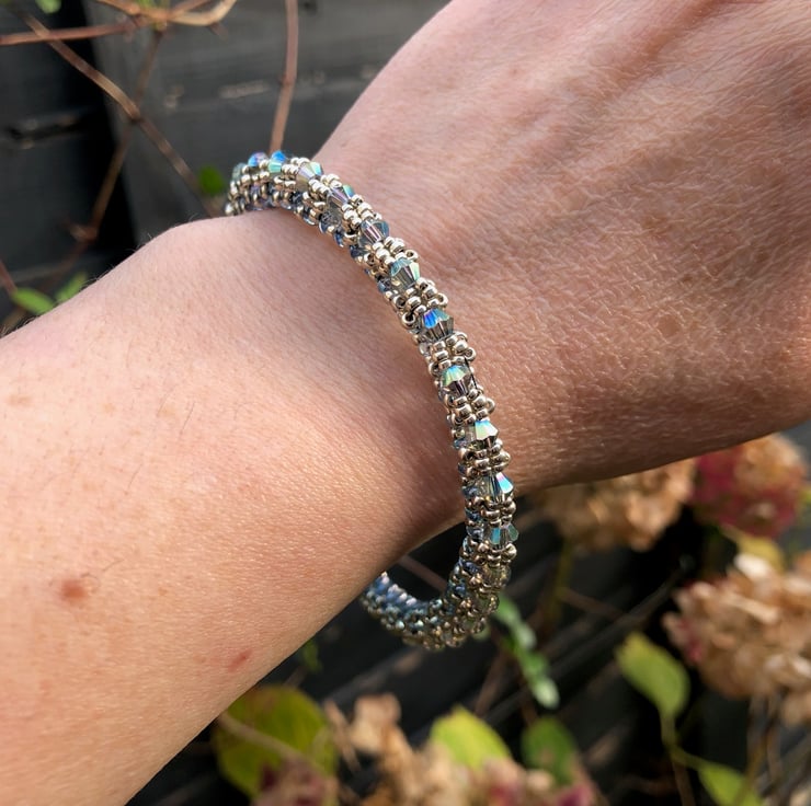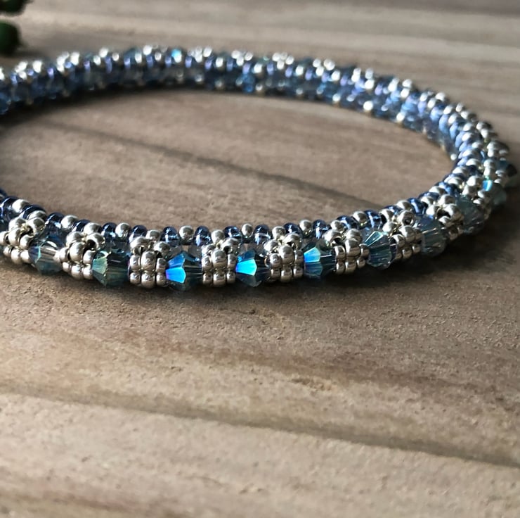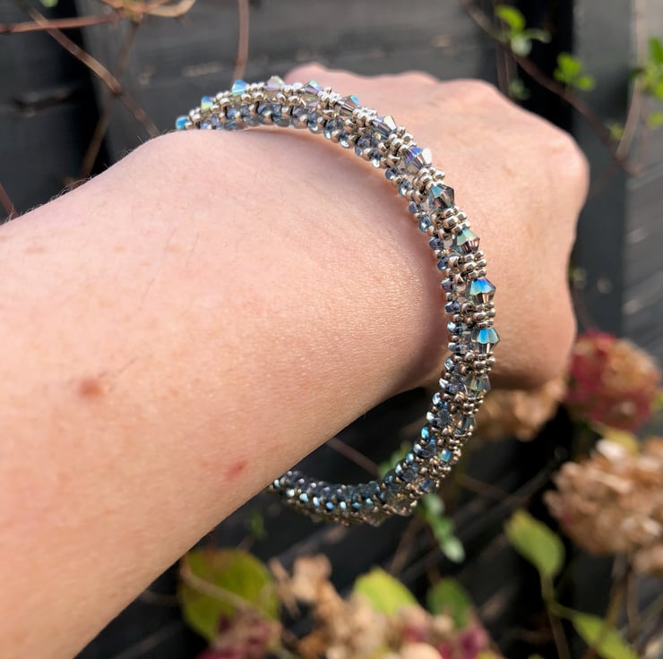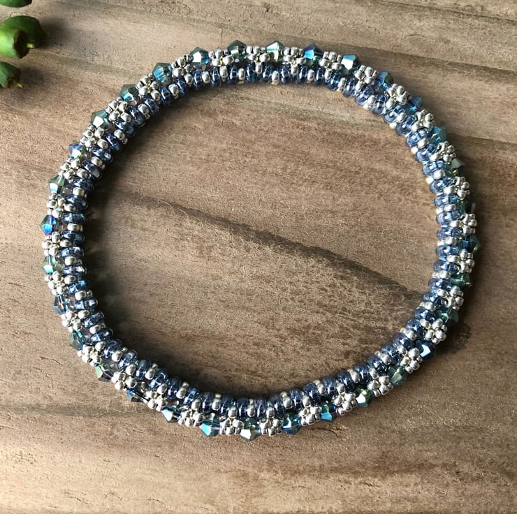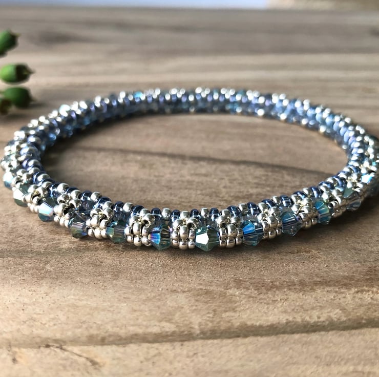 A hand-stitched bead-weave bangle bracelet with sparkly blue, grey and silver shimmering glass bicone beads that flash as they catch the light, and silver Japanese and Czech glass seed beads.